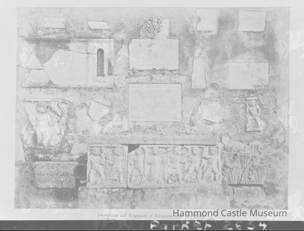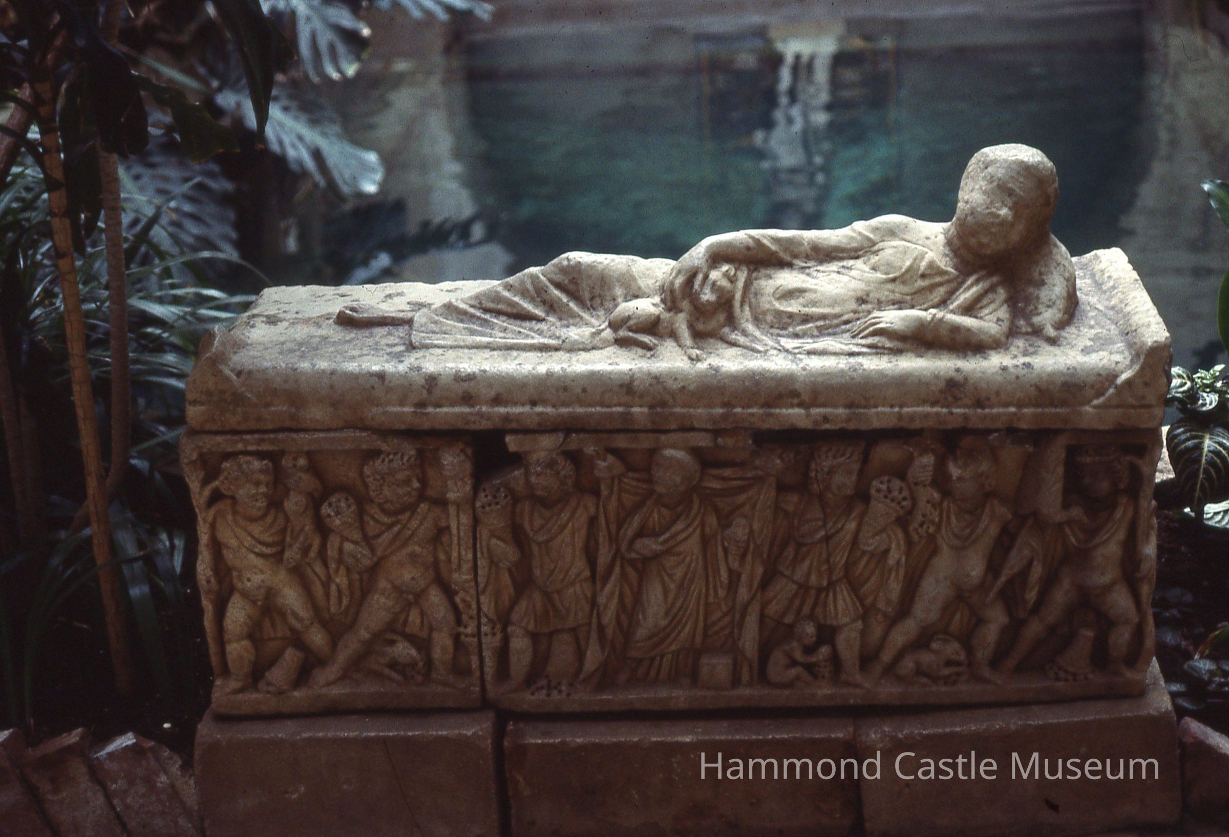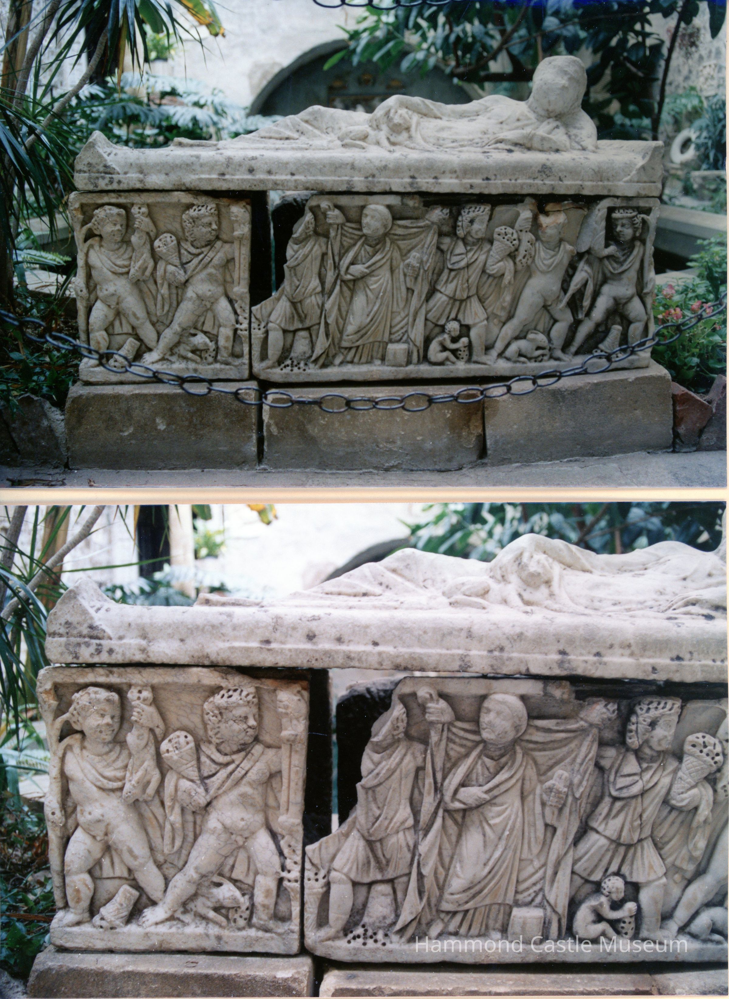 a) Sarcophagus front frieze has robed central figure with animals & figures representing the deceased with seasons on either side. The seasons are represented by their common Roman iconography (Spring with garlands, Summer with grain, Fall with grapes, Winter with ducks). However the season are not in order; the figures are, from left to right: winter, spring, the seasons generally, the deceased, the seasons generally, fall, and winter.