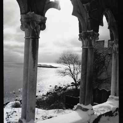 west side Hammond Castle in the winter with snow