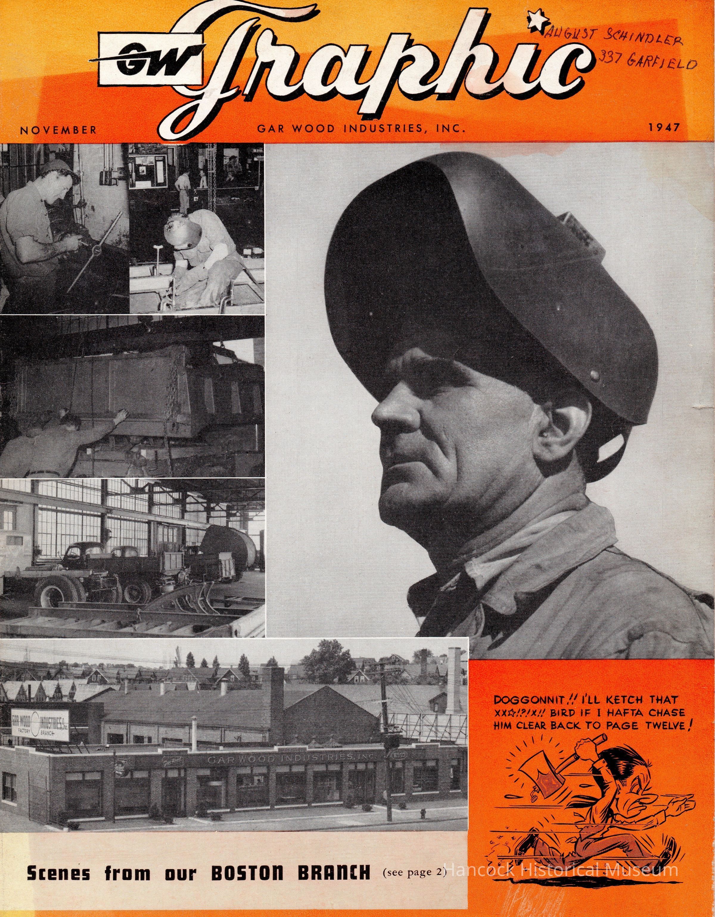 GW Graphic magazine for Gar Wood Industries, Wayne, Mi for Nov 1947; w/ profiles and stories of employees. Parent company of Gar Wood Industries, 200 Crystal Avenue, Findlay, Oh.