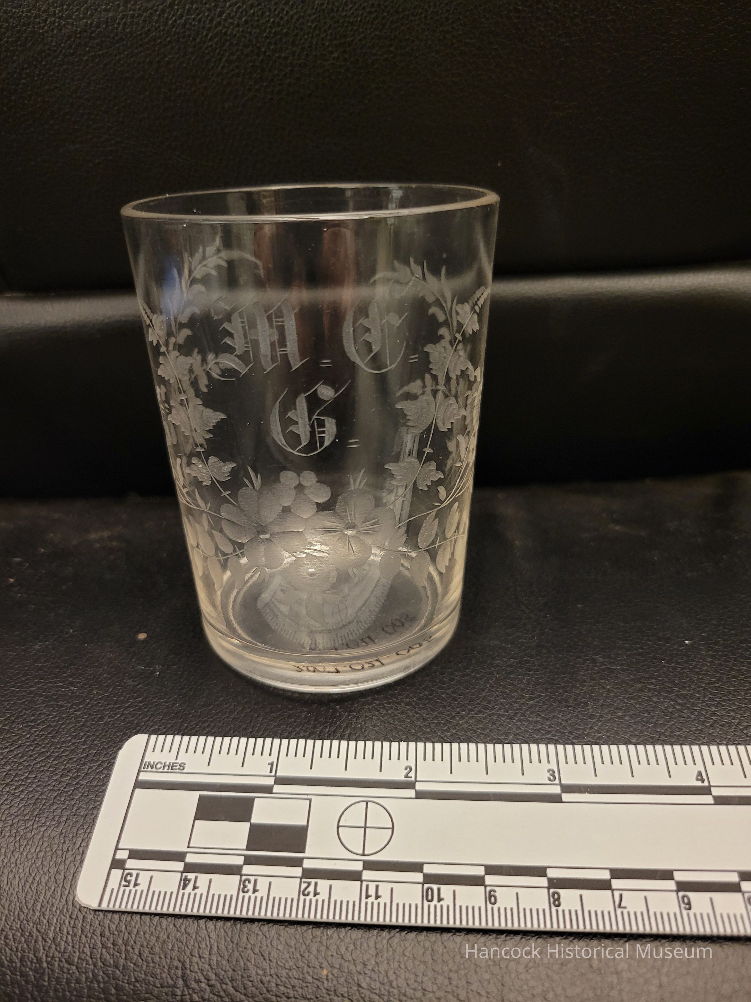 Part of a set of 6 made by Dalzell, Gilmore, and Leighton Company - initials M.F.G. - lightly cut floral and vine design matching pitcher in .001 - 3 1/2" tall, top diameter 2 3/4"