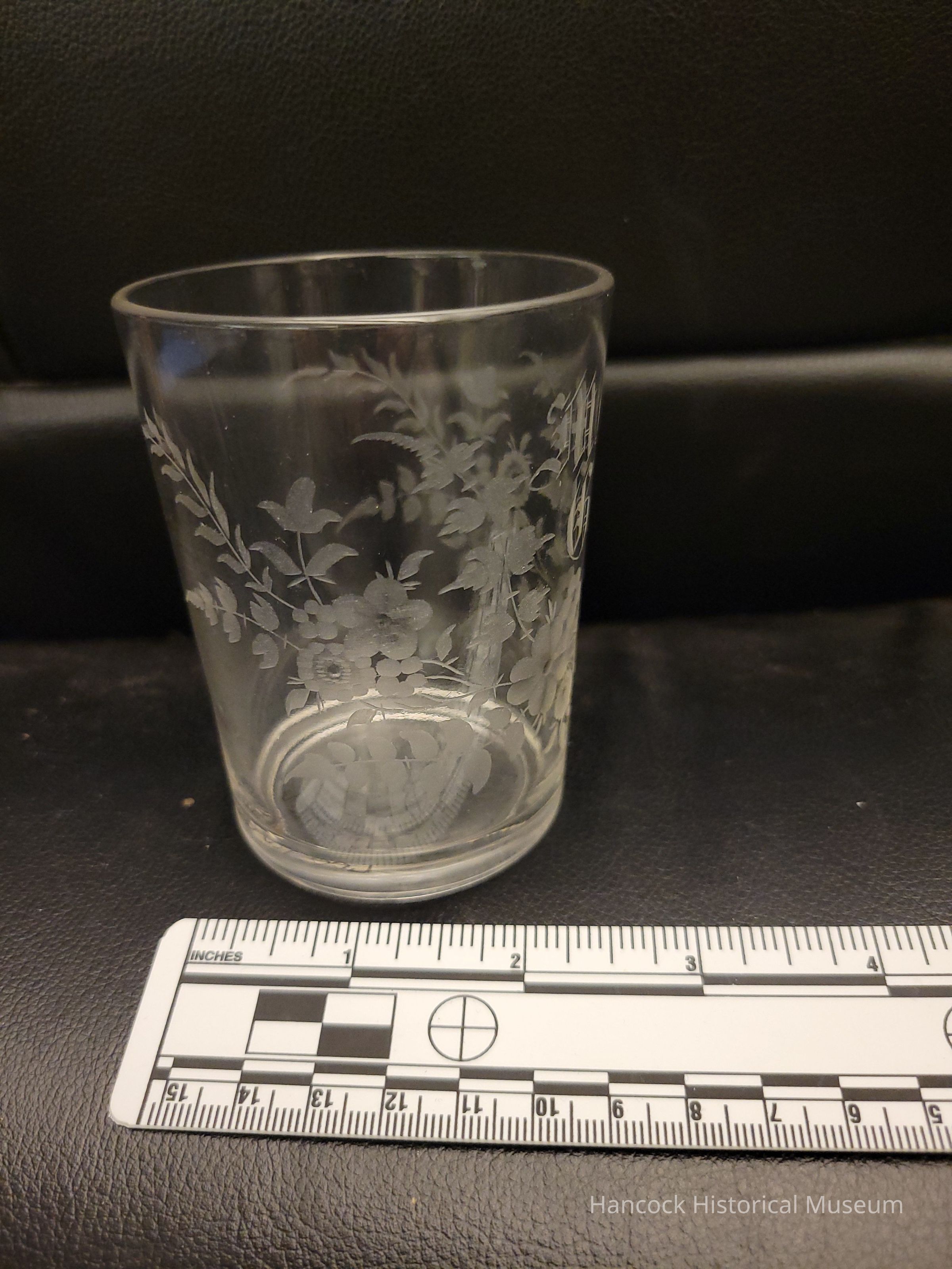 Part of a set of 6 made by Dalzell, Gilmore, and Leighton Company - initials M.F.G. - lightly cut floral and vine design matching pitcher in .001 - 3 1/2" tall, top diameter 2 3/4"