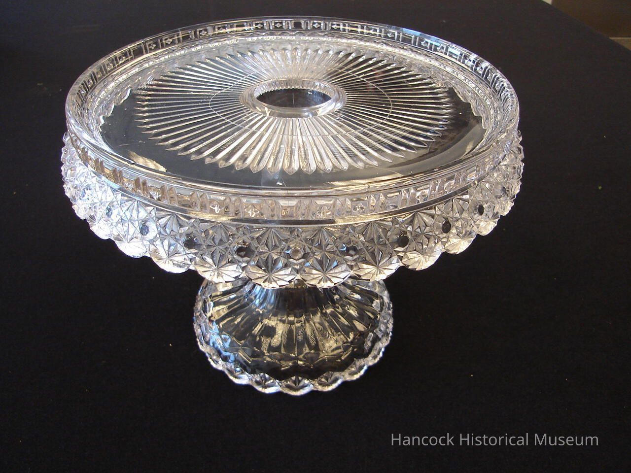 Starred Block pedestal cake plate from Dalzell Gilmore Glass Co, Findlay, Oh