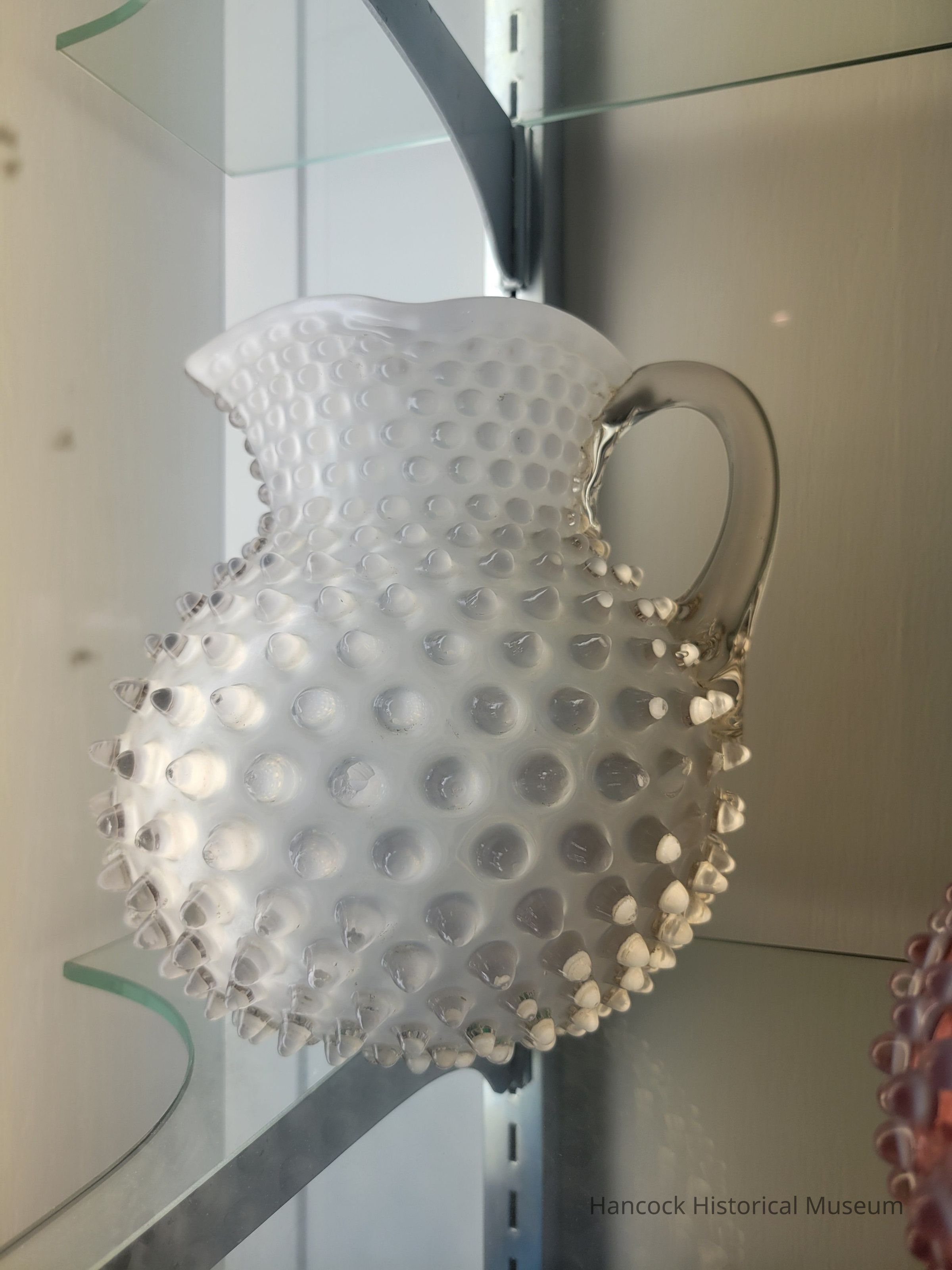 Glass pitcher, hobnail, clear with white lining.