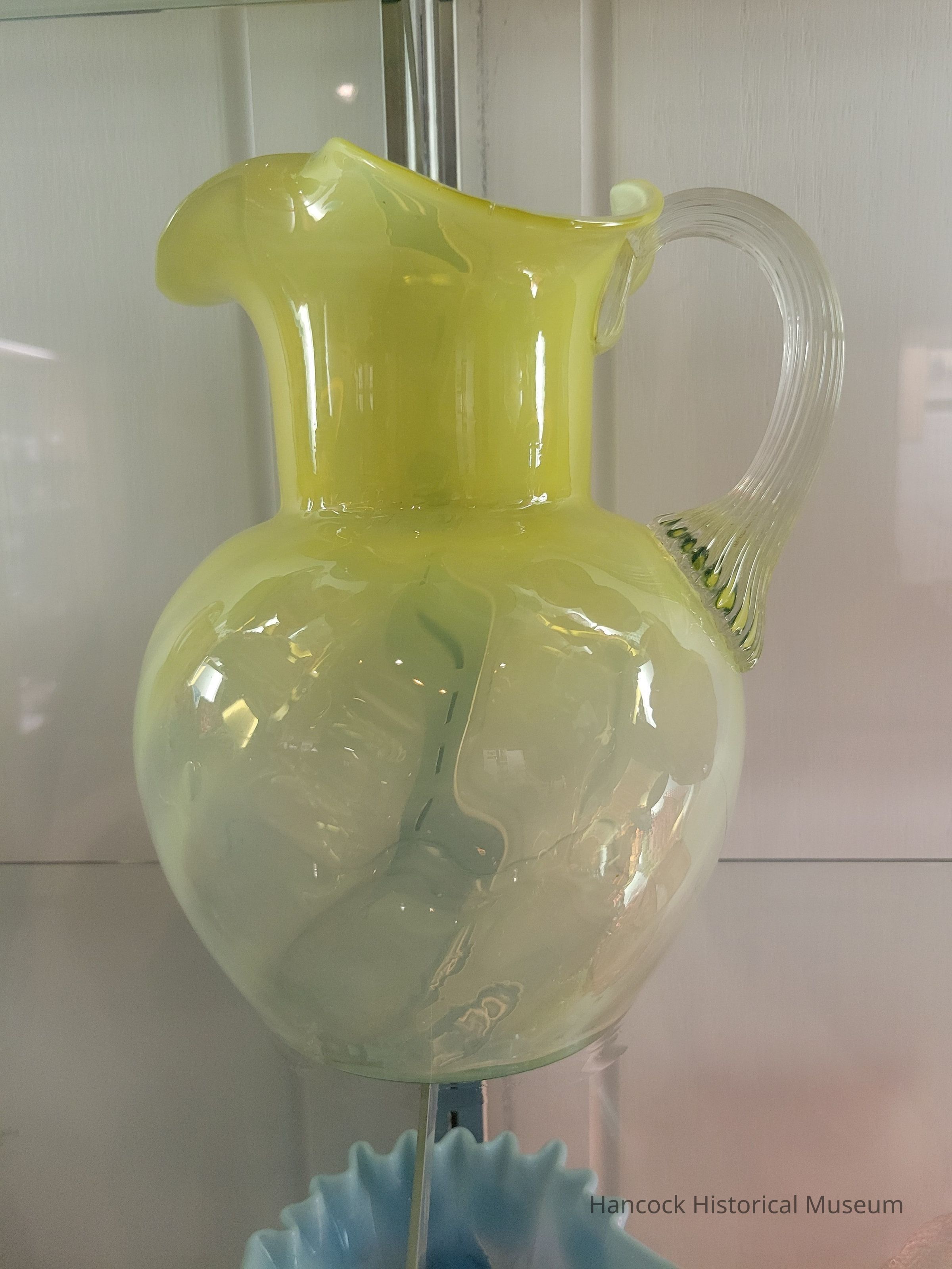 Glass pitcher yellow green opalescent, applied handle.