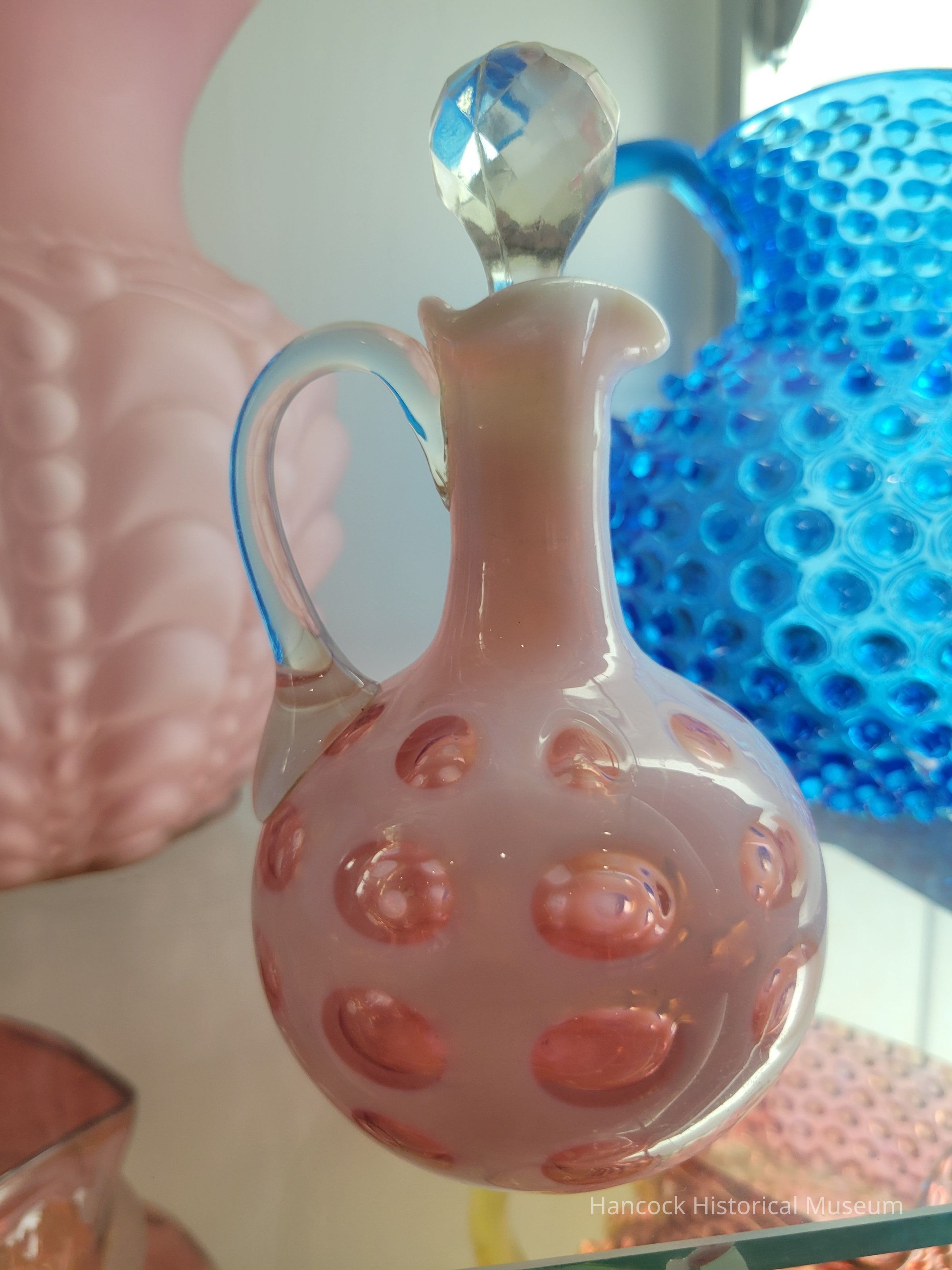 Glass cruet cranberry overlay, white tope, clear handle & stopper.