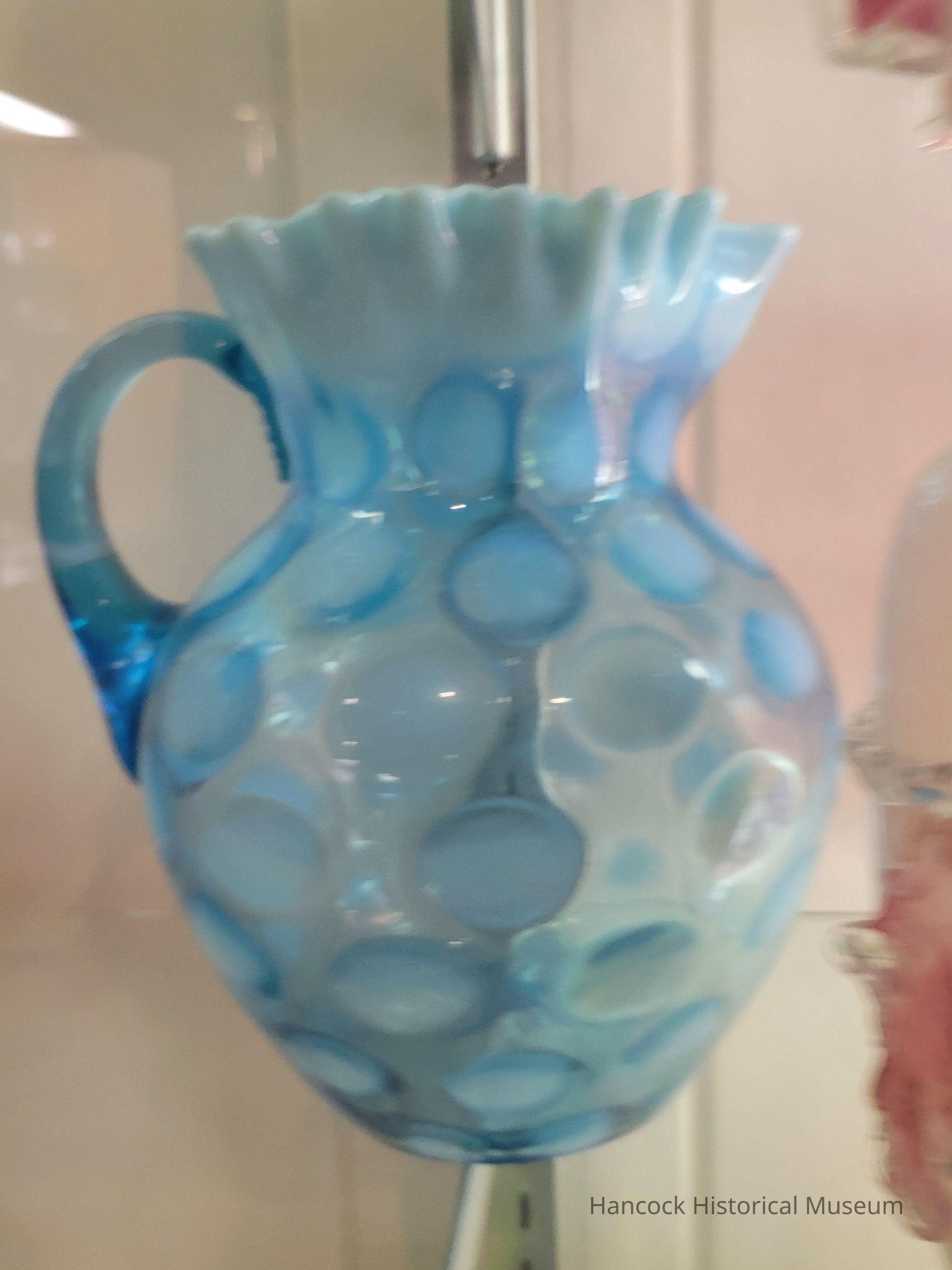 Glass pitcher coin spot, blue opalescent.