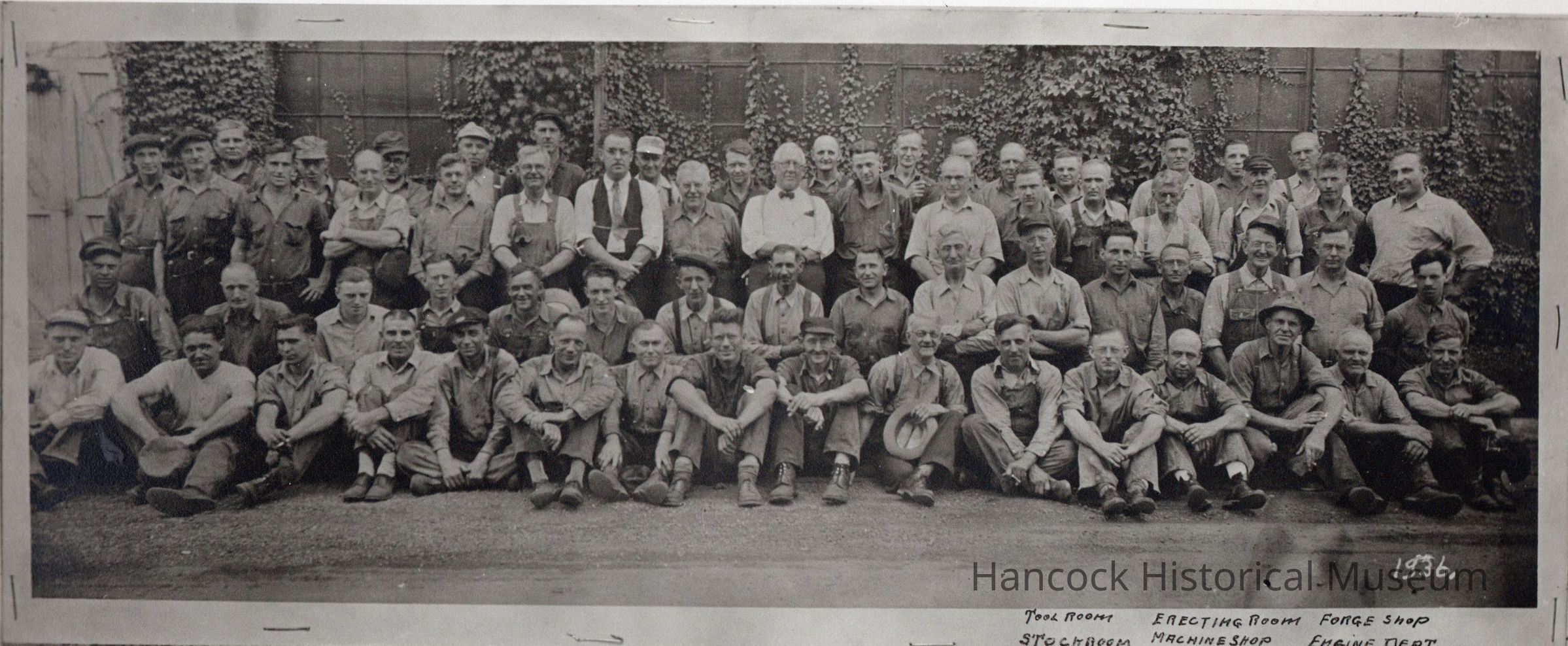 The employees of BTDC taking a group photo. Employees shown here are from the Tool Room, Erecting Room, Forge Shop, Stock Room, Machine Shop, and Engine Dept.Photograph Details