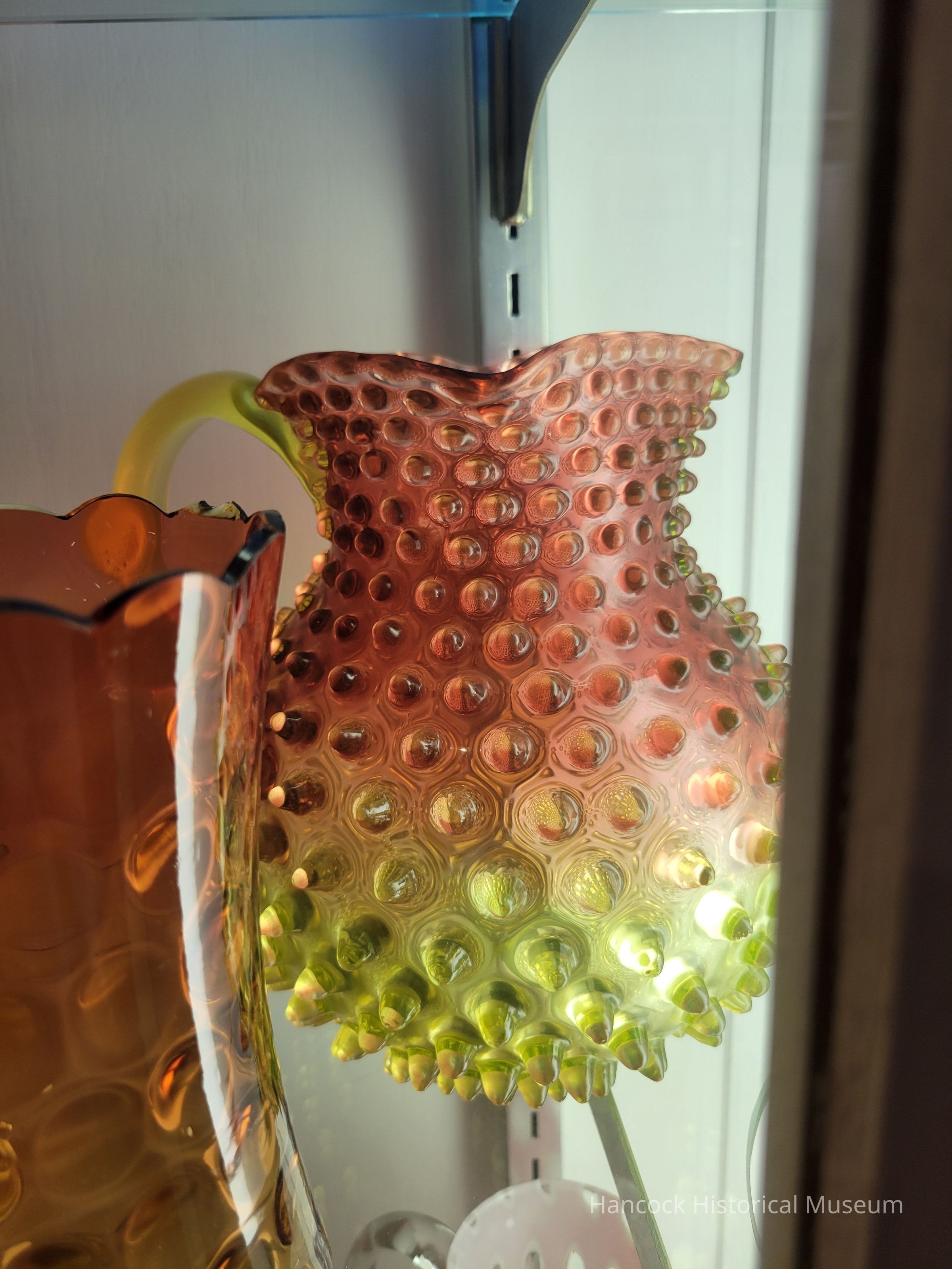 Glass pitcher Hobnail, amber runina w/partial ruby lining.