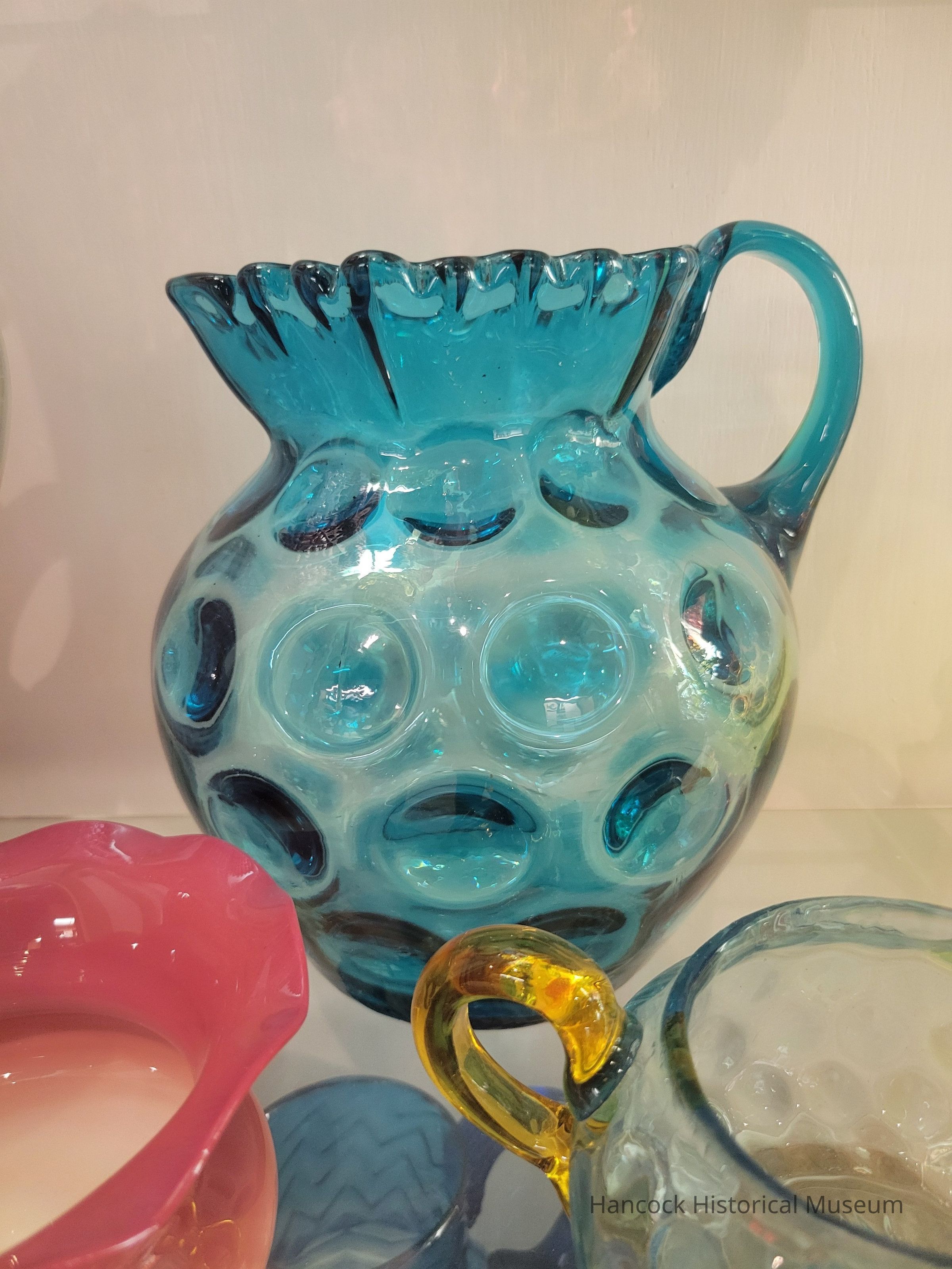 Glass pitcher inverted thumbprint peacock blue, fluted top.