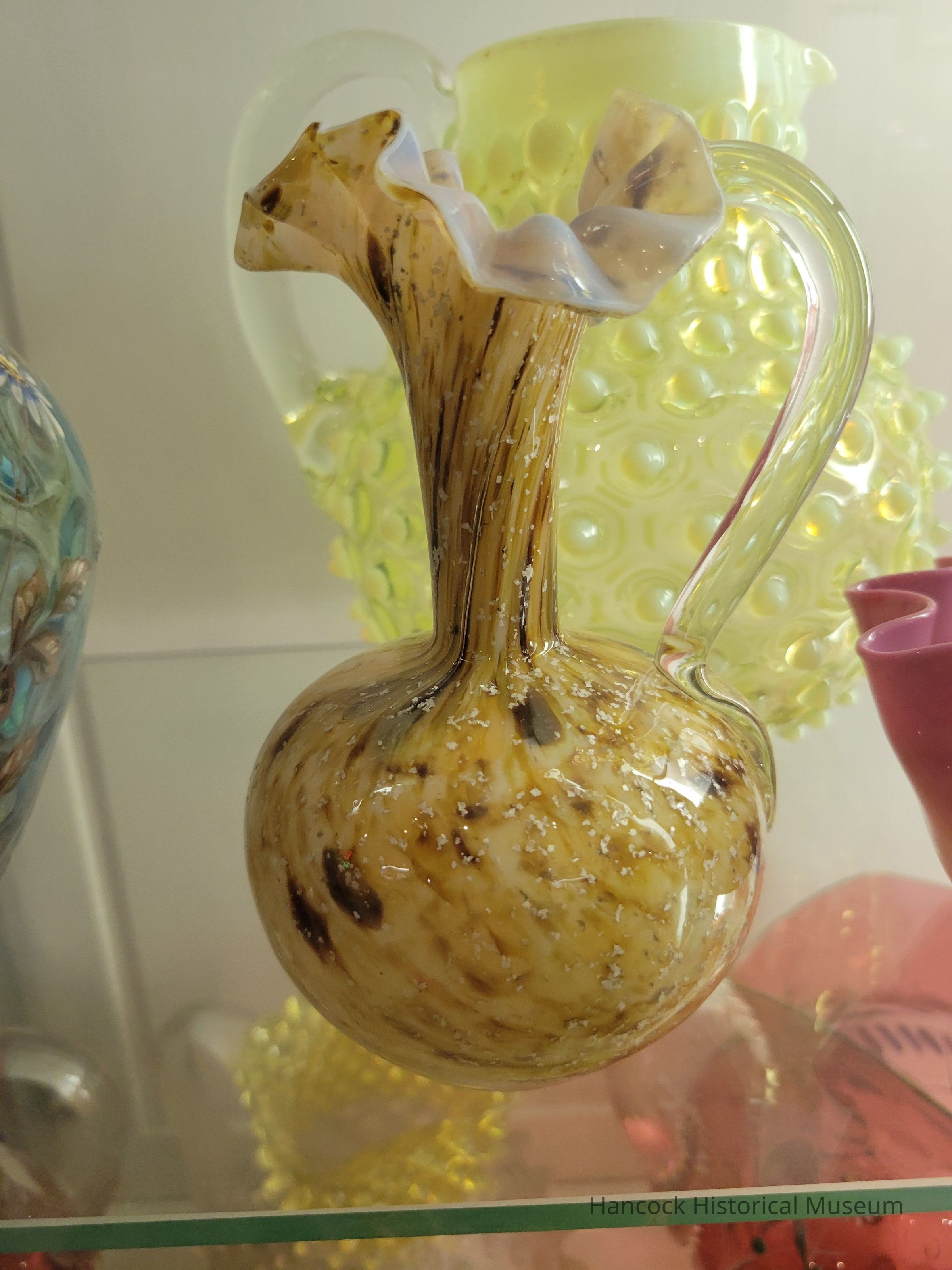 Glass Ewer cruet shaped end-o-day, Vasa Murrhina with white lining.