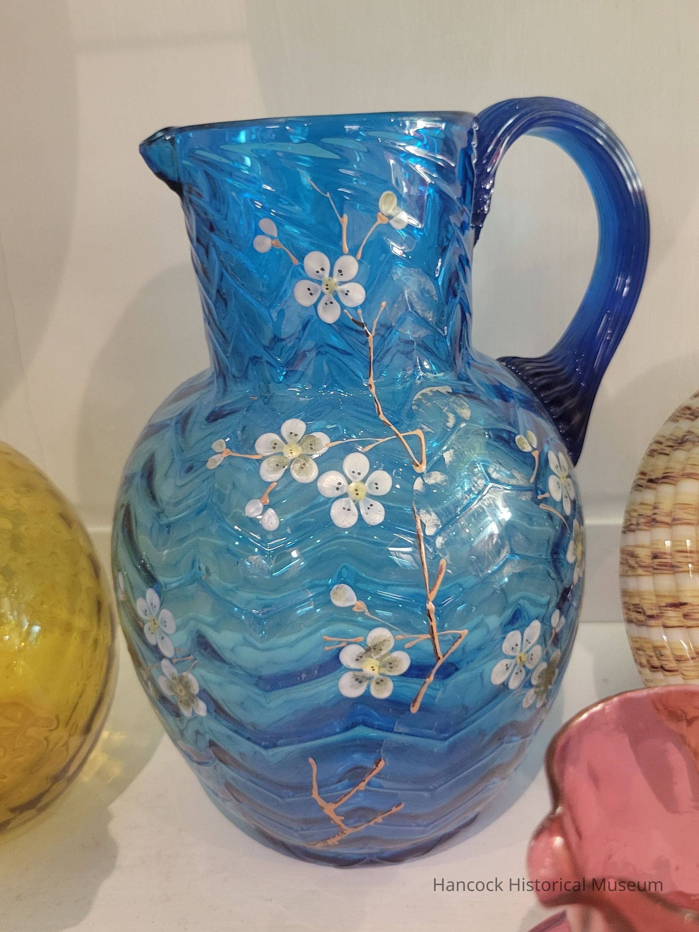 Glass pitcher herringbone design, blue w/enamel decoration.
