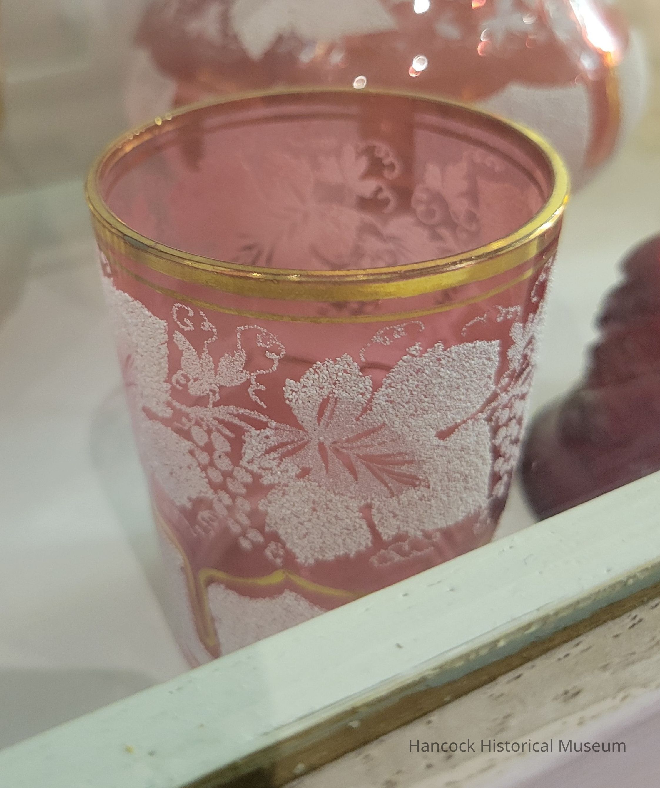 Glass tumbler white sanded leaf design, ruby w/gold banding