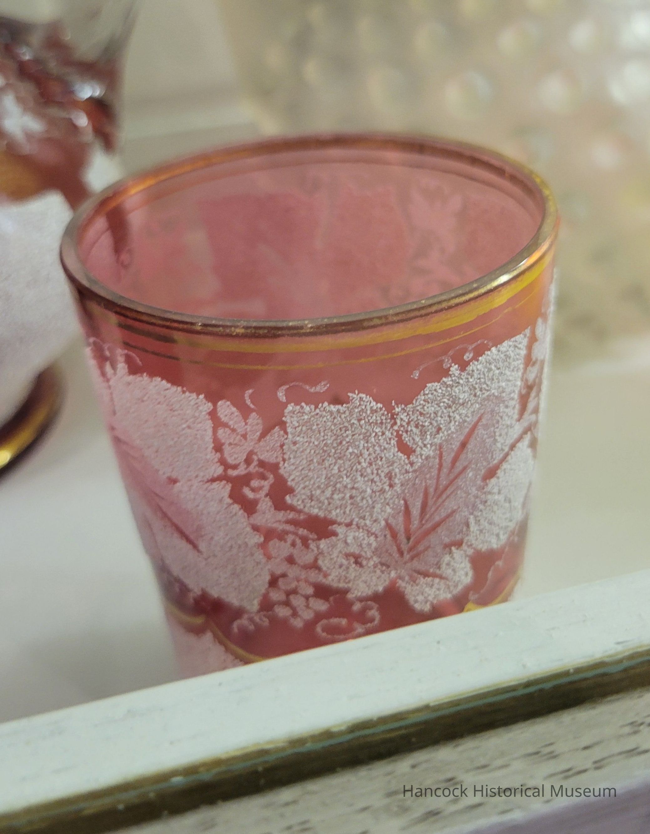 tumbler white sanded leaf design ruby, gold banding, fluted top.