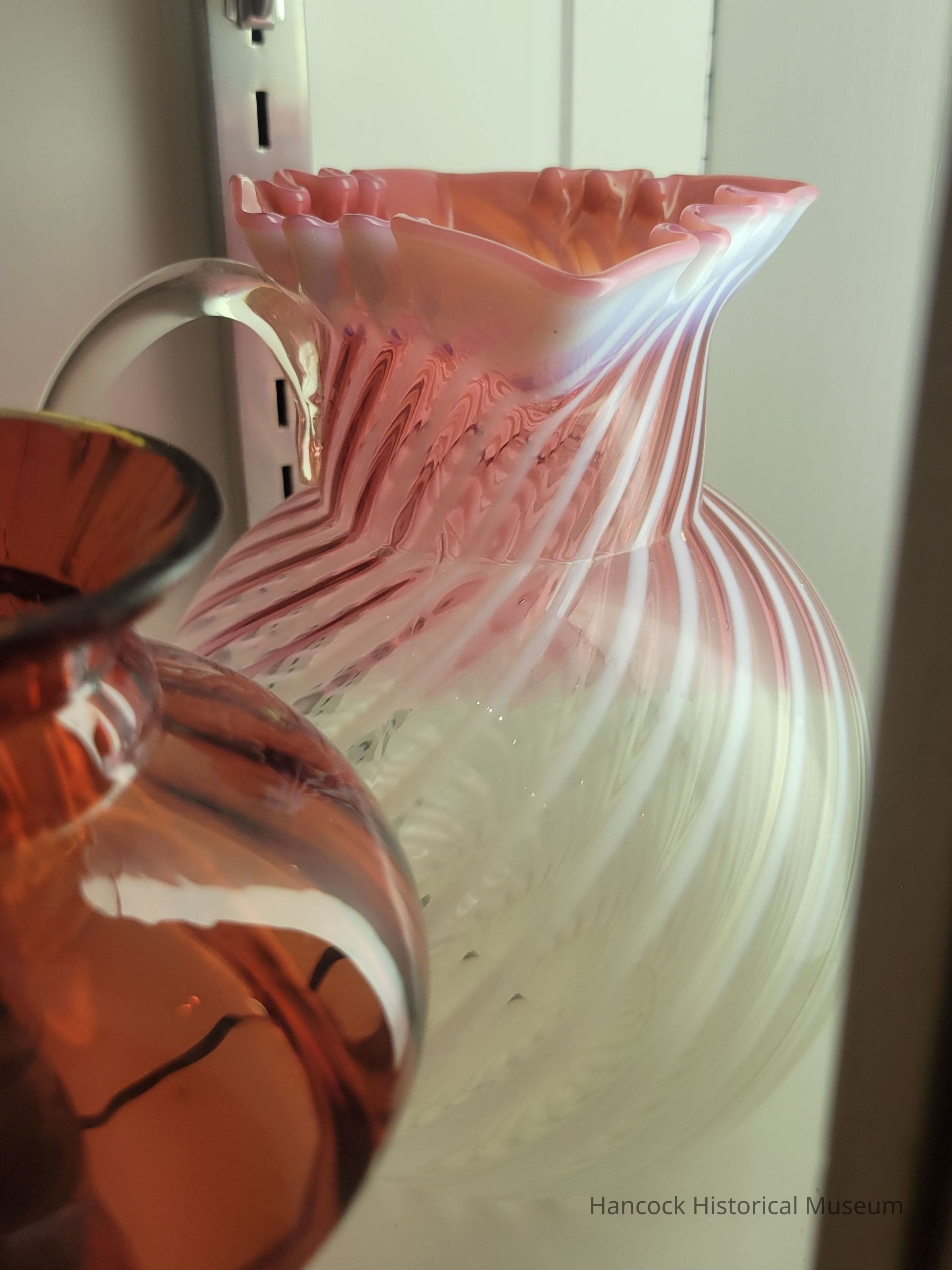 Glass pitcher opalescent band and swirl, clear with cranberry top.