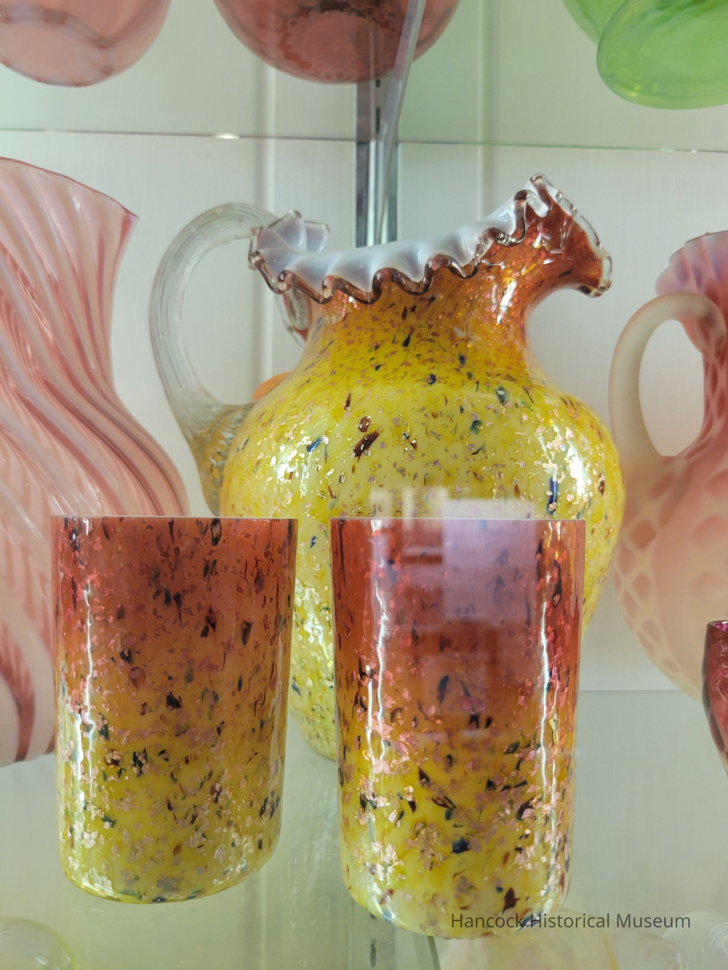 Glass pitcher Vasa Murrhina, yellow bottom, red top & clear handle. with 2 matching tumblers