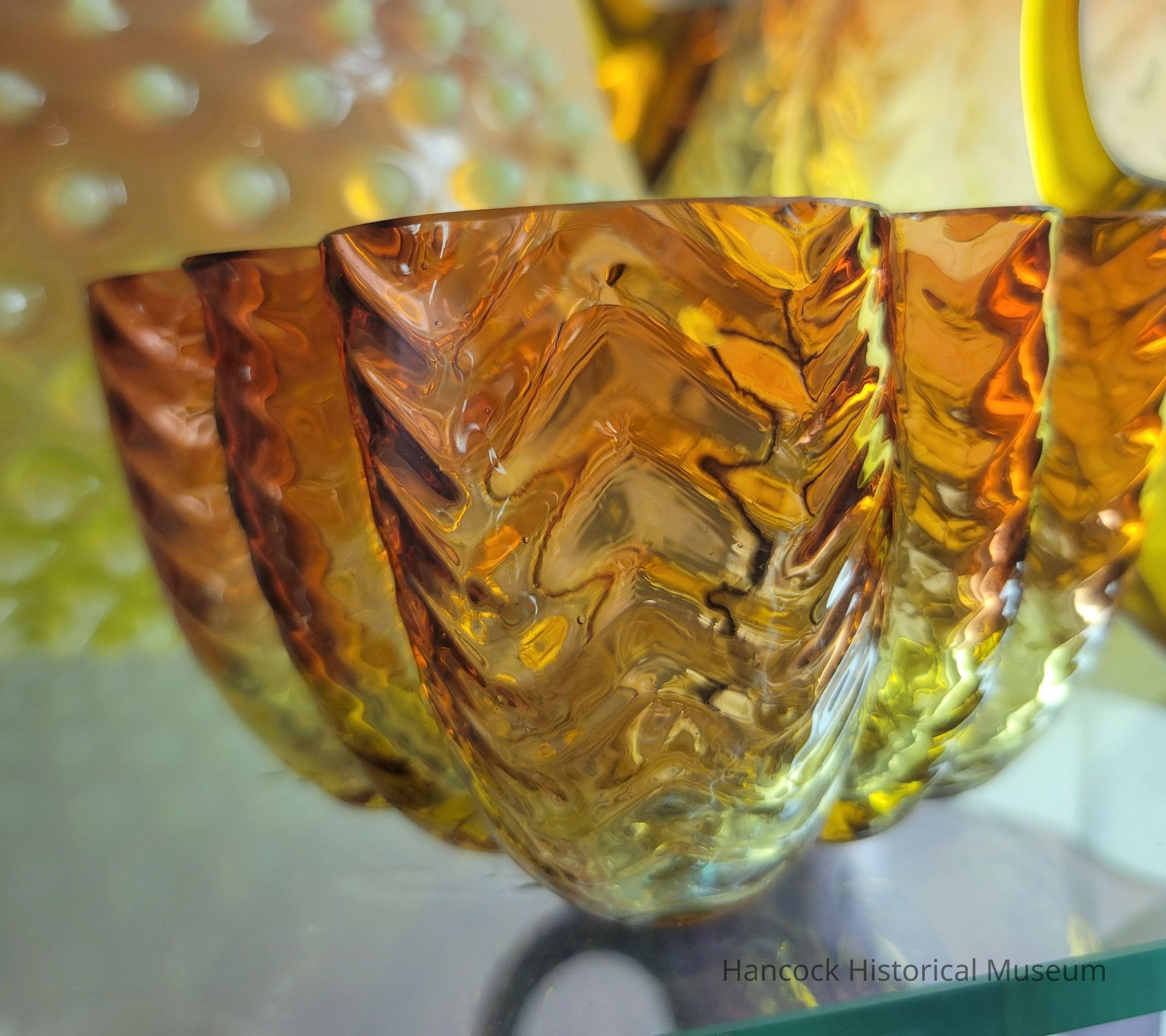 Glass finger bowl, Herringbone design, amberina.