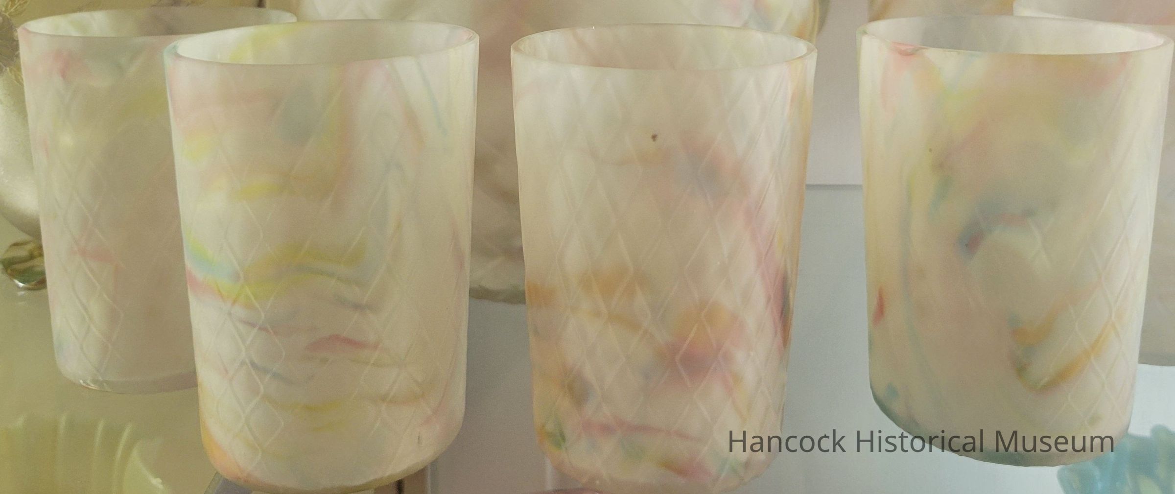 Glass quilted design, rainbow spatter ware, satin finish.