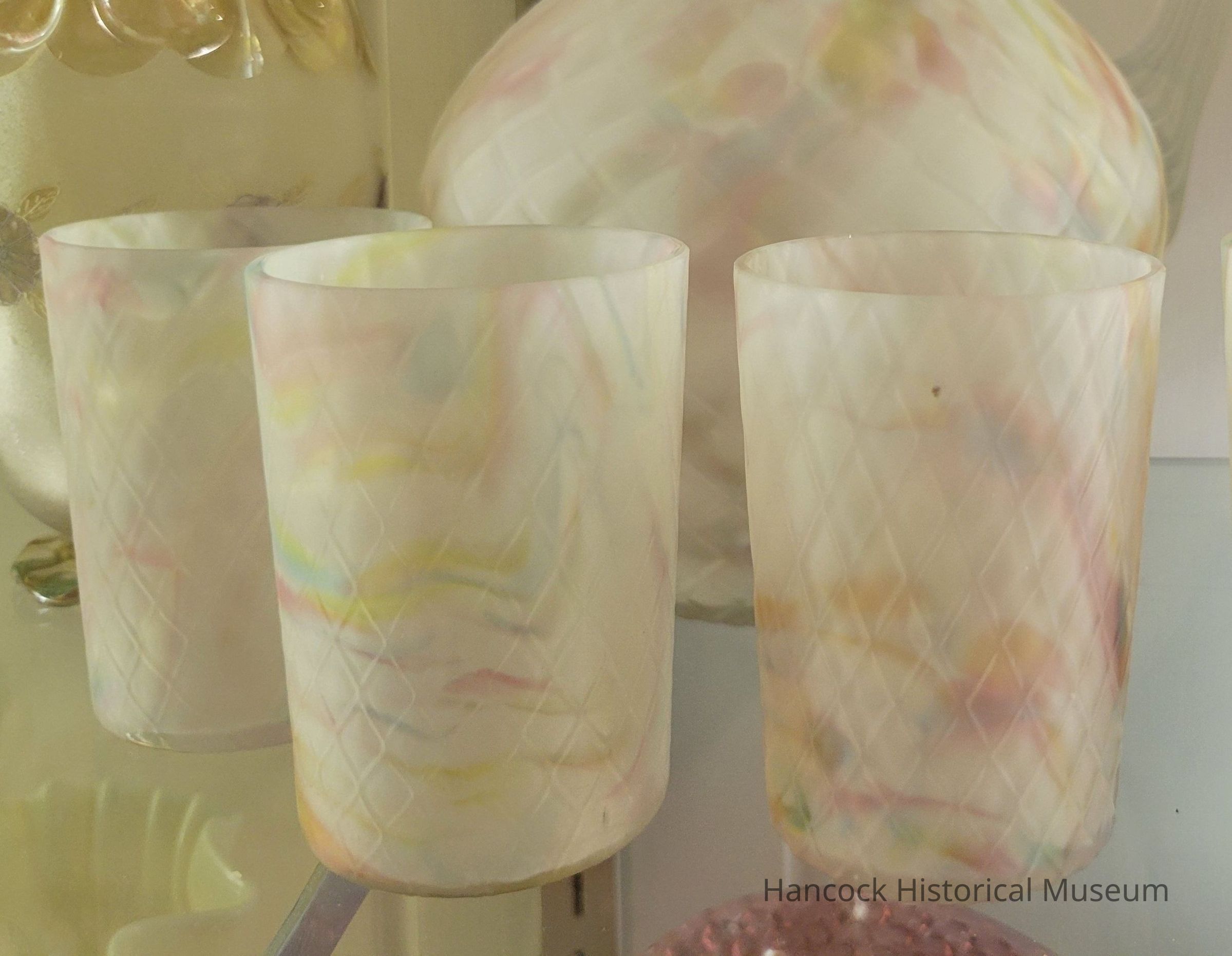 Glass tumbler quilted pattern, rainbow spatter ware, satin finsih.