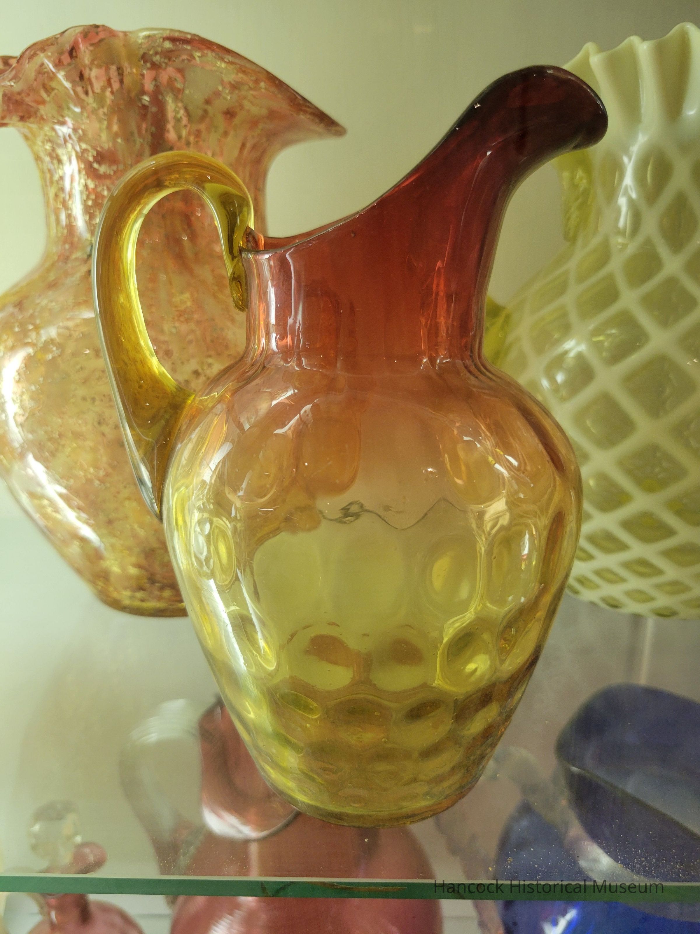 Glass pitcher inverted thumbprint, amberina.