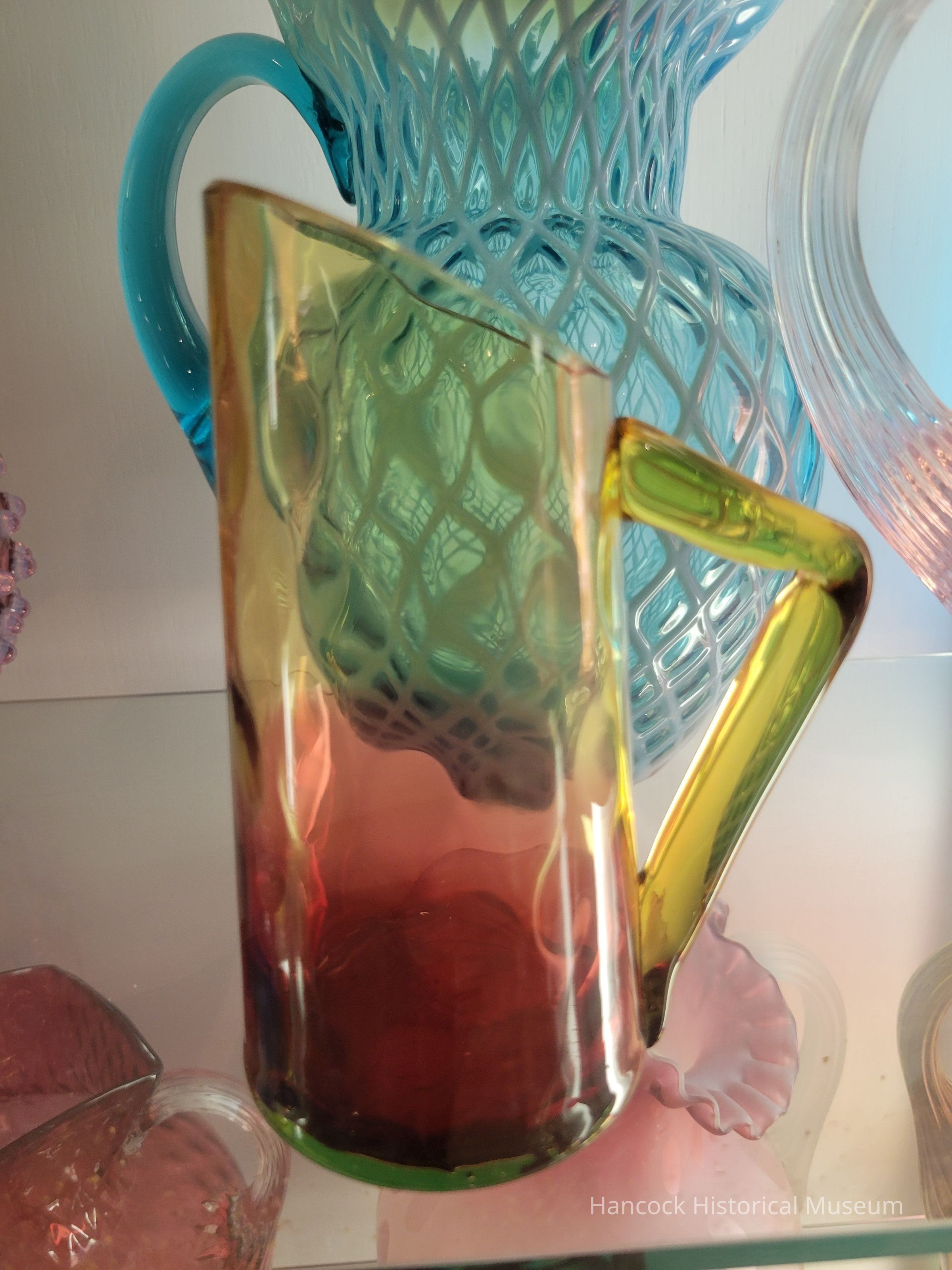 Glass pitcher inverted thumprint, reverse amberina.