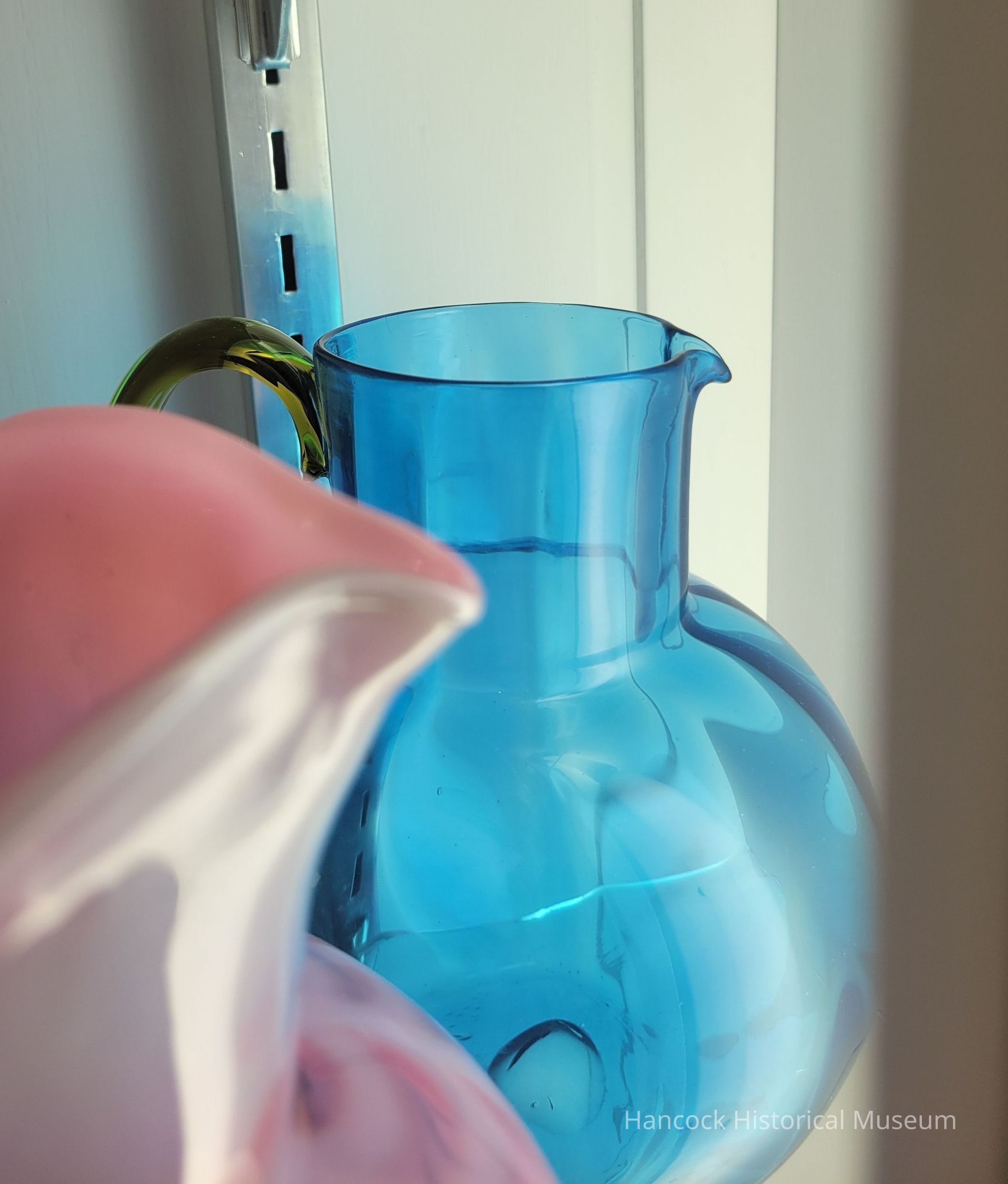 Glass pitcher clear blue, amber handle.