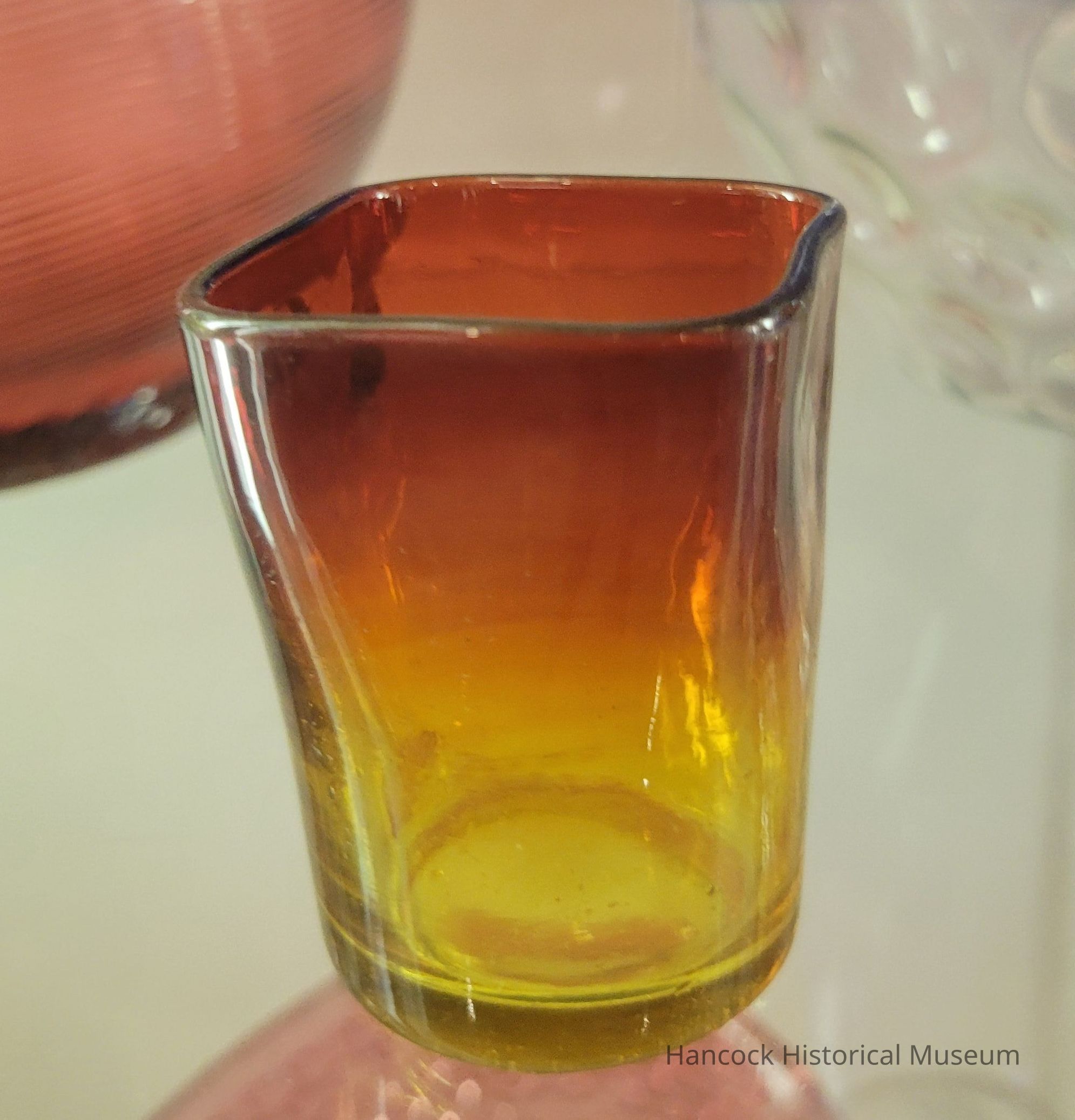Glass toothpick holder square top, amberina.