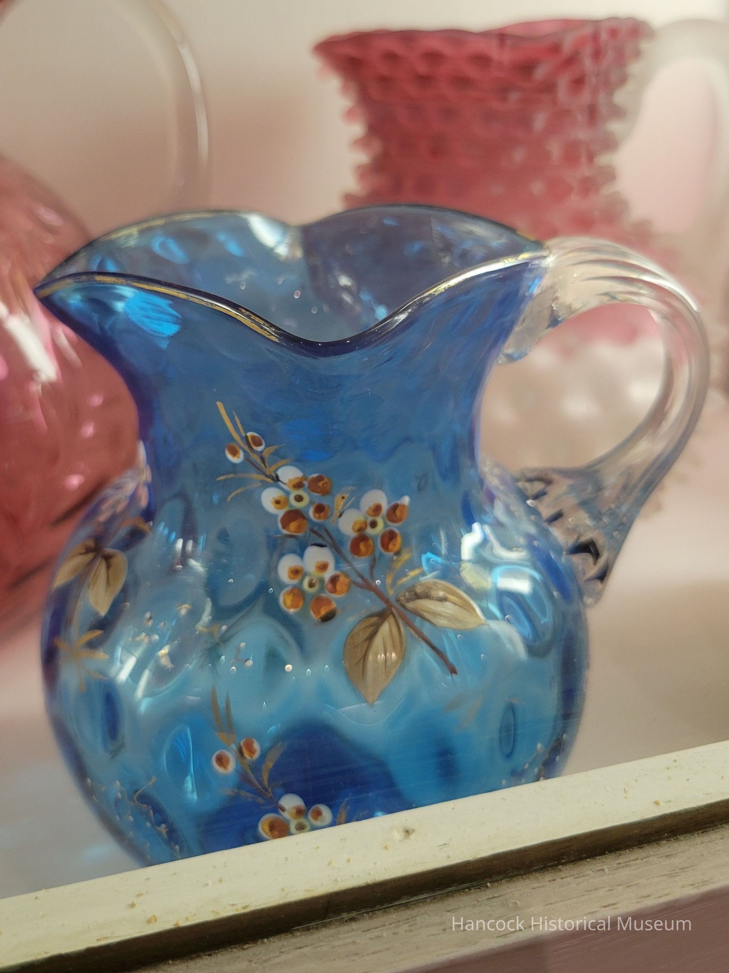 Glass cream pitcher inverted thumbprint, blue with enamel decorations.