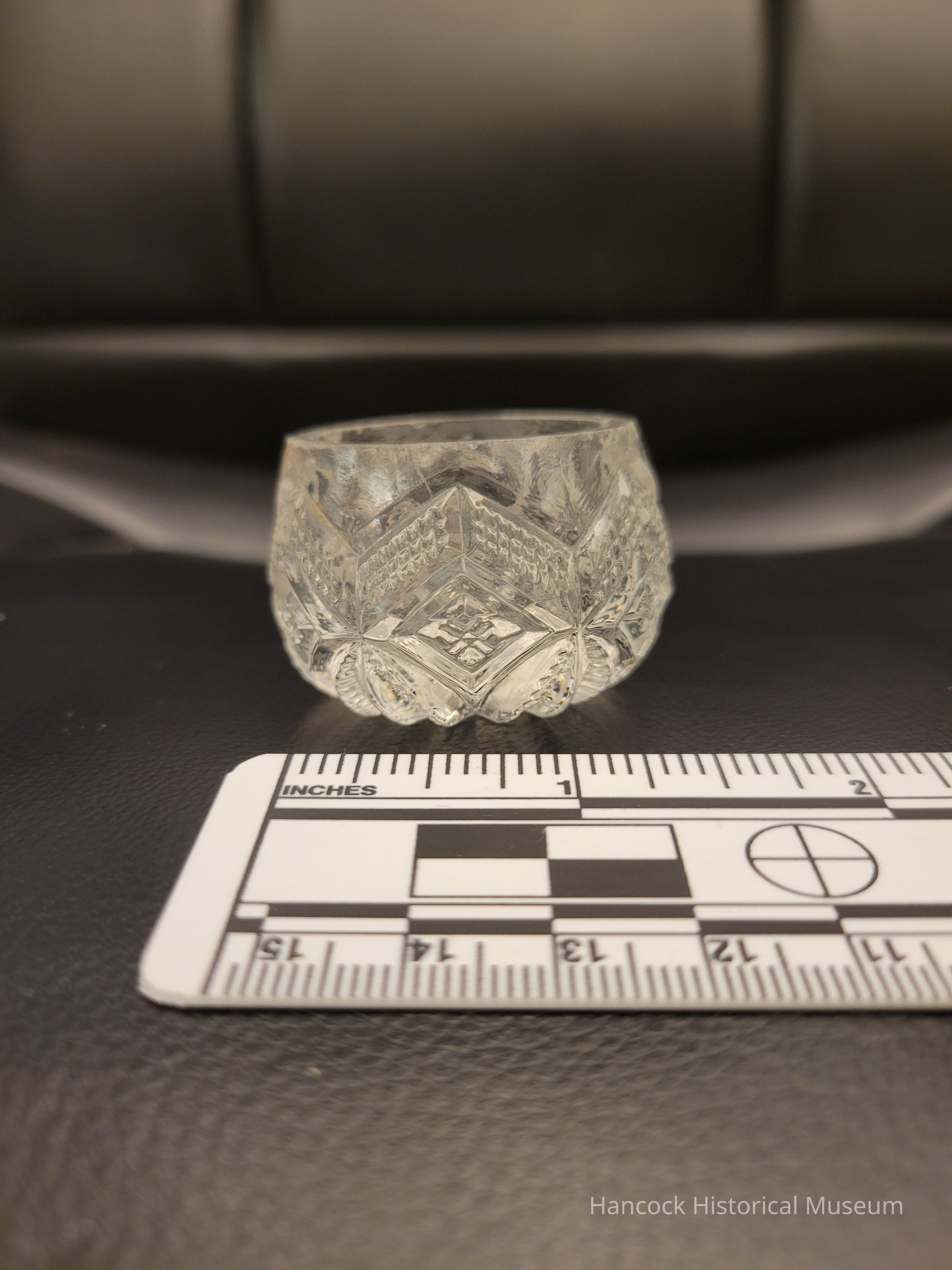 2 x 1 1/2" clear glass Ivanhoe pattern salt dish by Dalzell Gilmore Glass Co, Findlay, Oh.