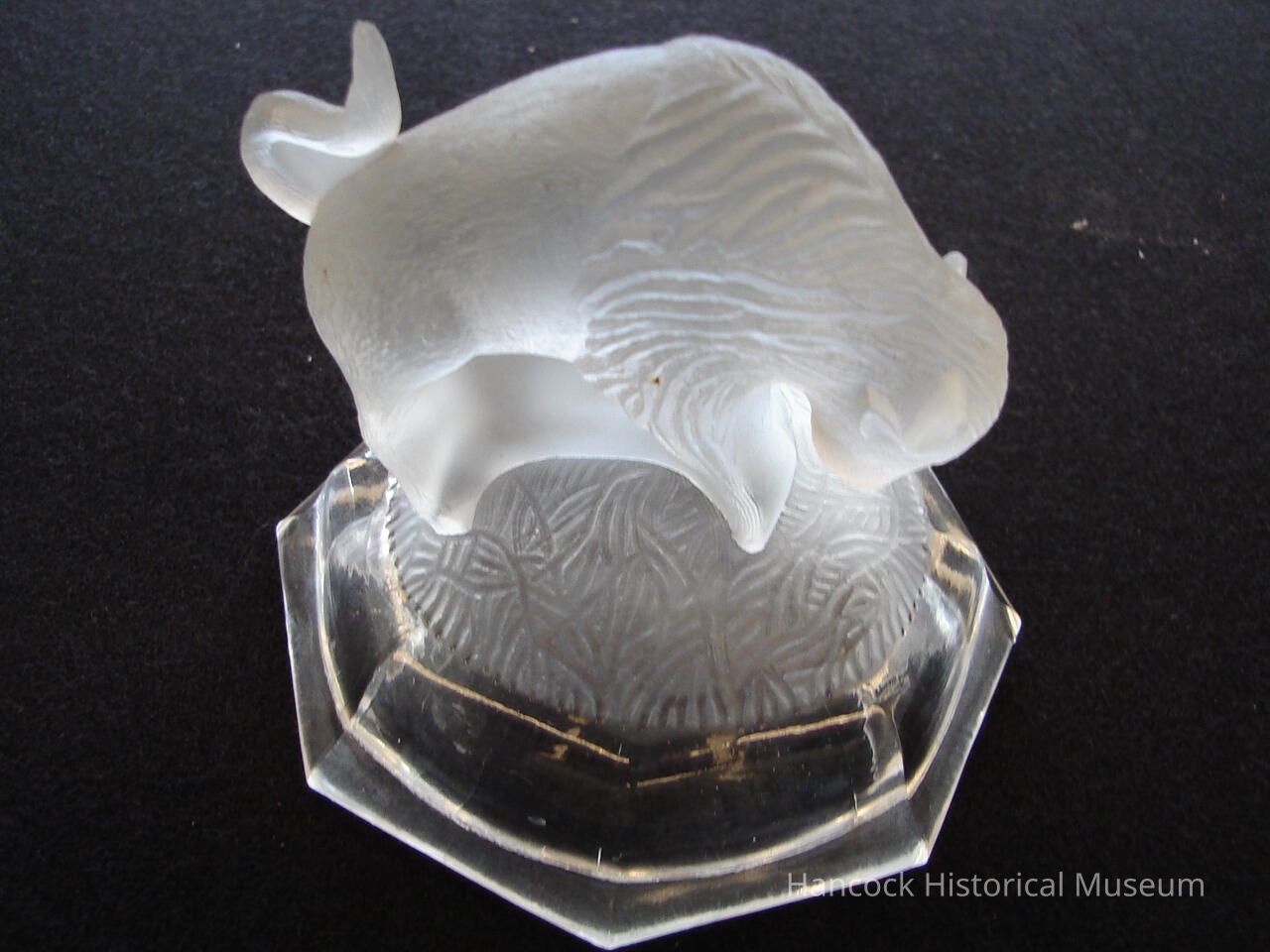 4 x 4 clear glass paperweight with a buffalo on top of 8 sided bottom made for the Buffalo Exposition of 1901 in Buffalo, NY by Dalzell Gilmore & Leighton Glass Co, Findlay, OhCollection