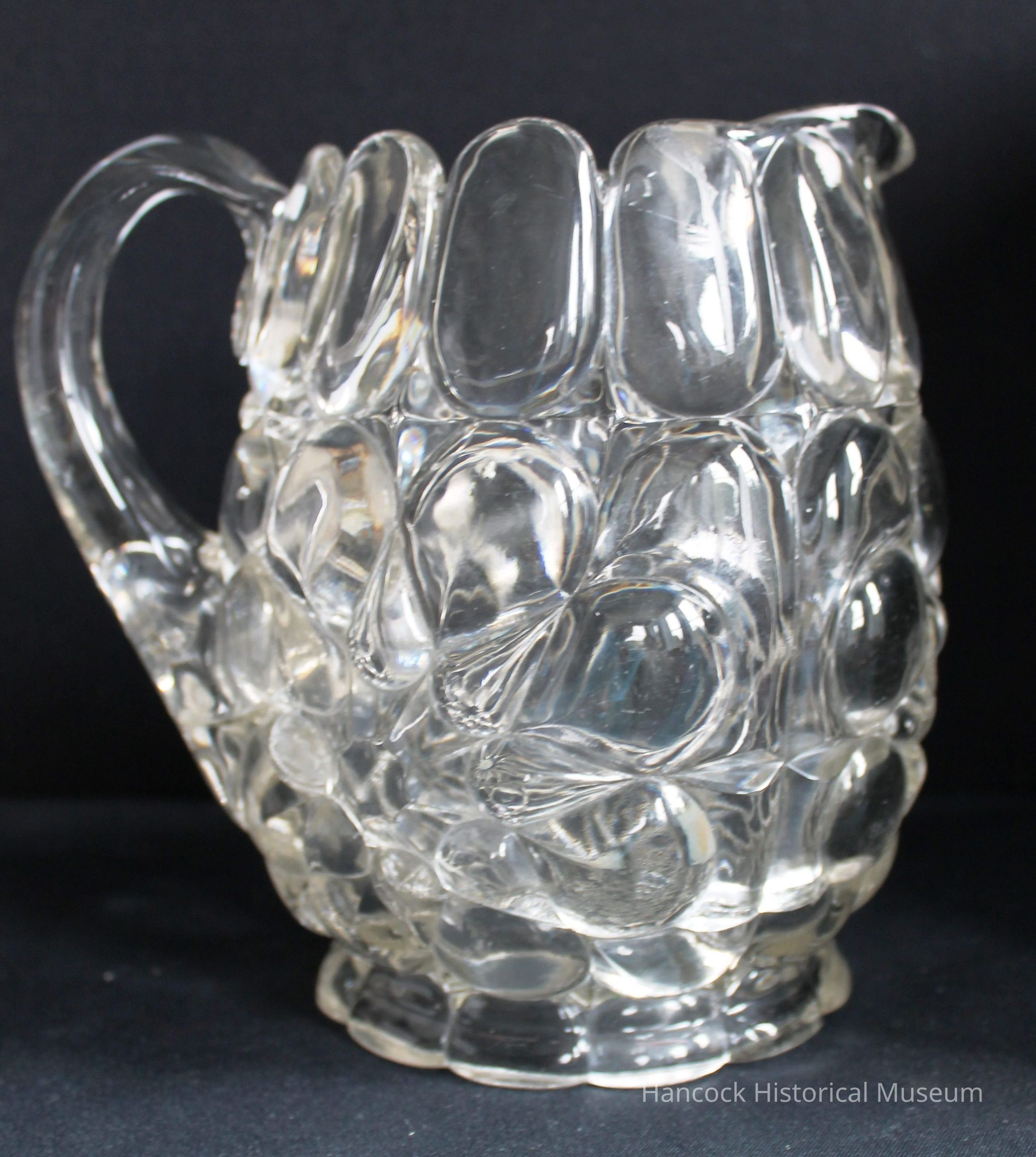 Clear glass water pitcher Queens Necklace pattern from Bellaire Goblet Co, Findlay, Oh. Broken and repaired