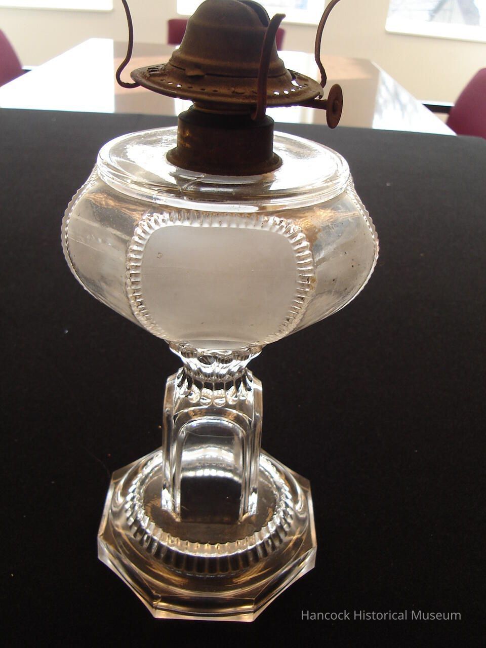 Clear base glass Crown Lamp w/metal prone burner by Dalzell Gilmore & Leighton Glass Co, Findlay, Oh. Remnants of painted leaves on lamp.