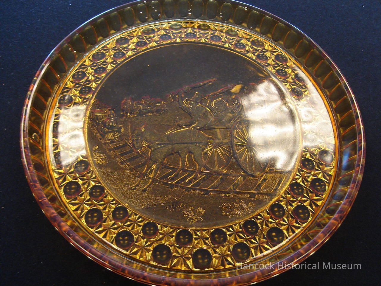 Amber Plate 12" currier & Ives Balky Mule Plate from Bellaire Goblet Co, Findlay, Oh.Collection
