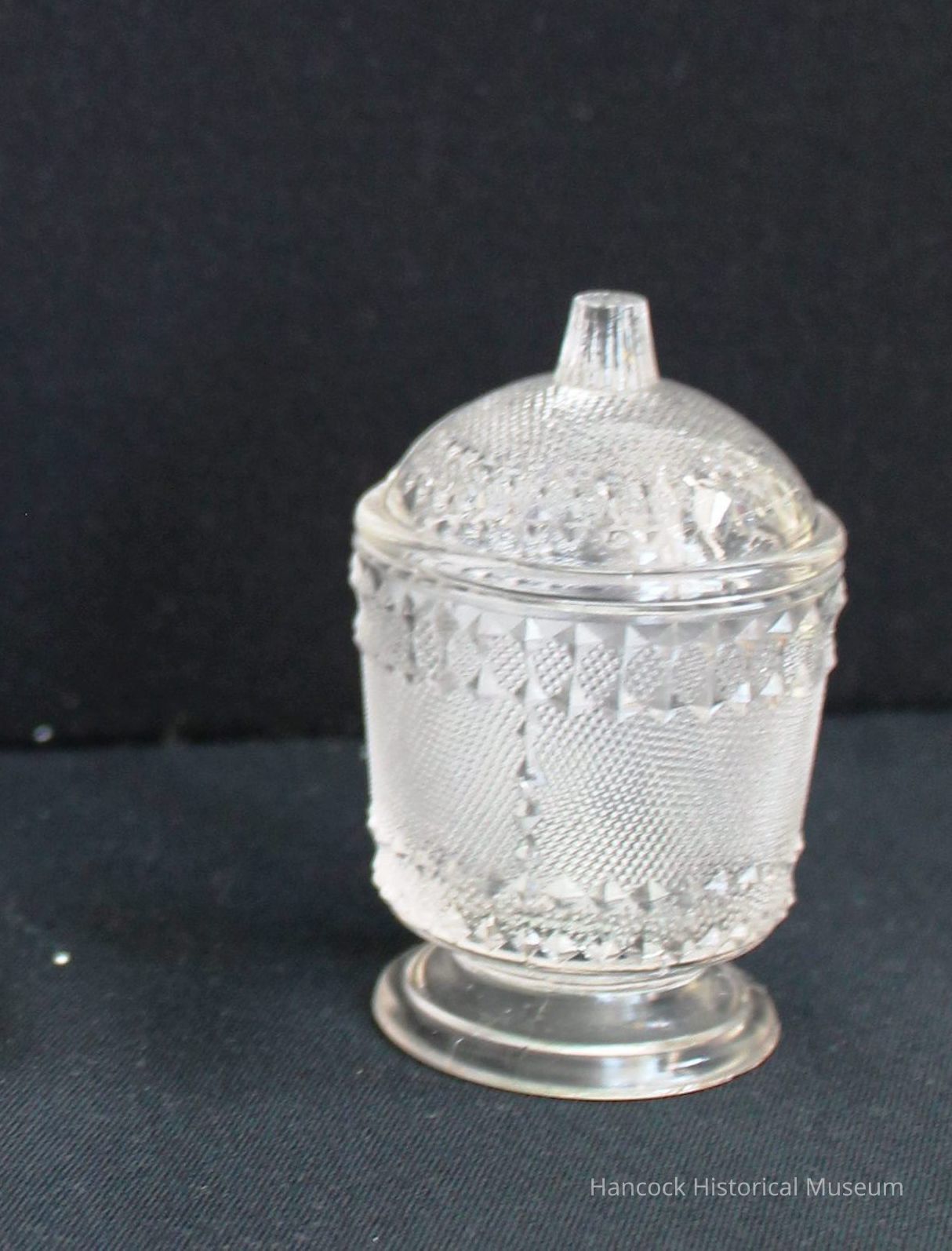 3" clear glass child's covered sugar bowl Stippled Forget Me Not Pattern from Findlay Flint Glass Co, Findlay, Oh. Lid is broken.