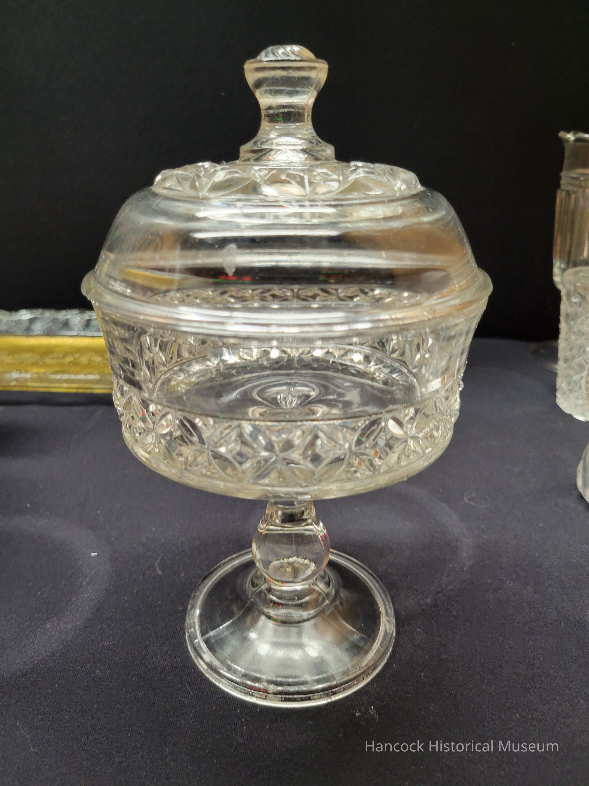 5" clear glass covered compote Pillow Encircled pattern from Model Flint Glass Co. Chip in lid rim