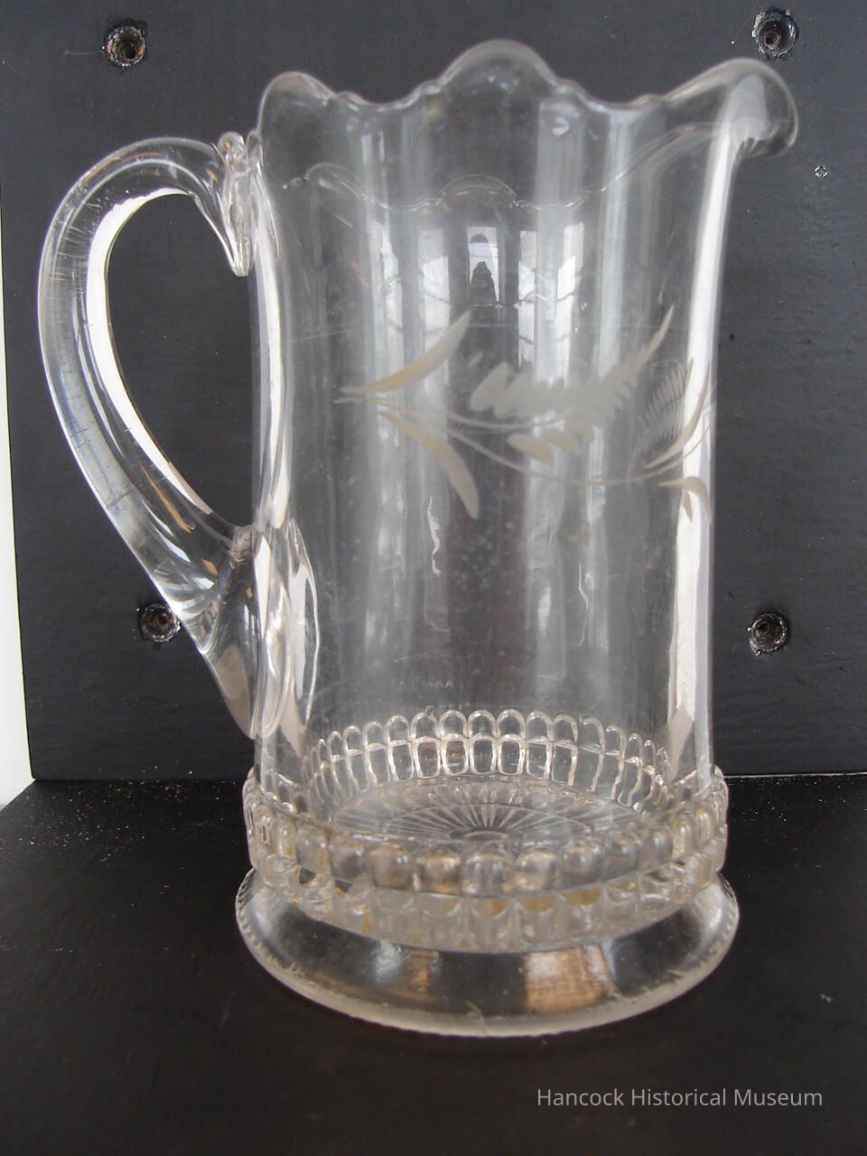 5" clear glass cream pitcher engraved Little Bullet Band pattern from Columbia Glass Co, Findlay, Oh.