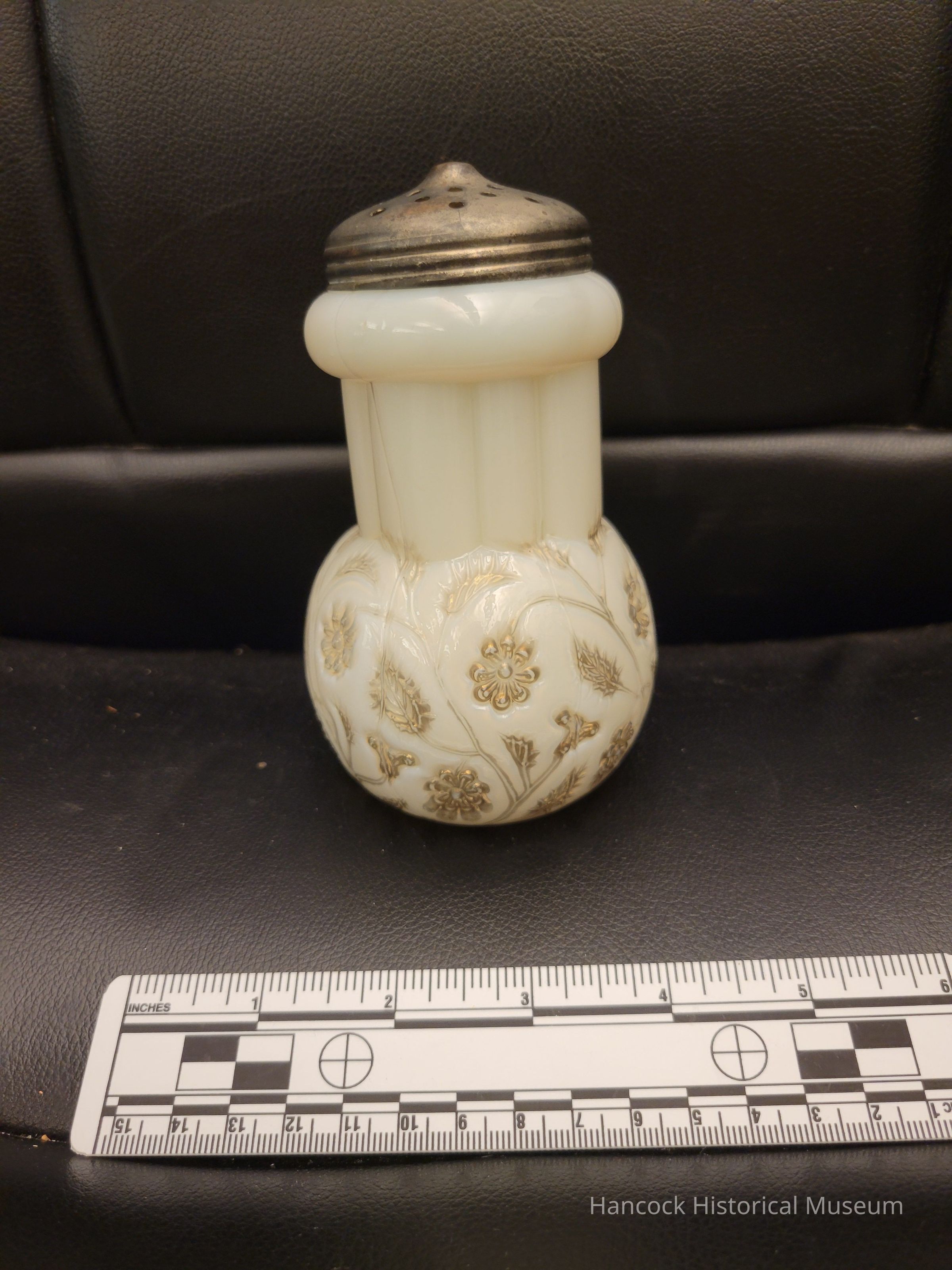 5" silver onyx sugar shaker with Metal lid from Dalzell Gilmore & Leighton Glass Co, Findlay, Oh.