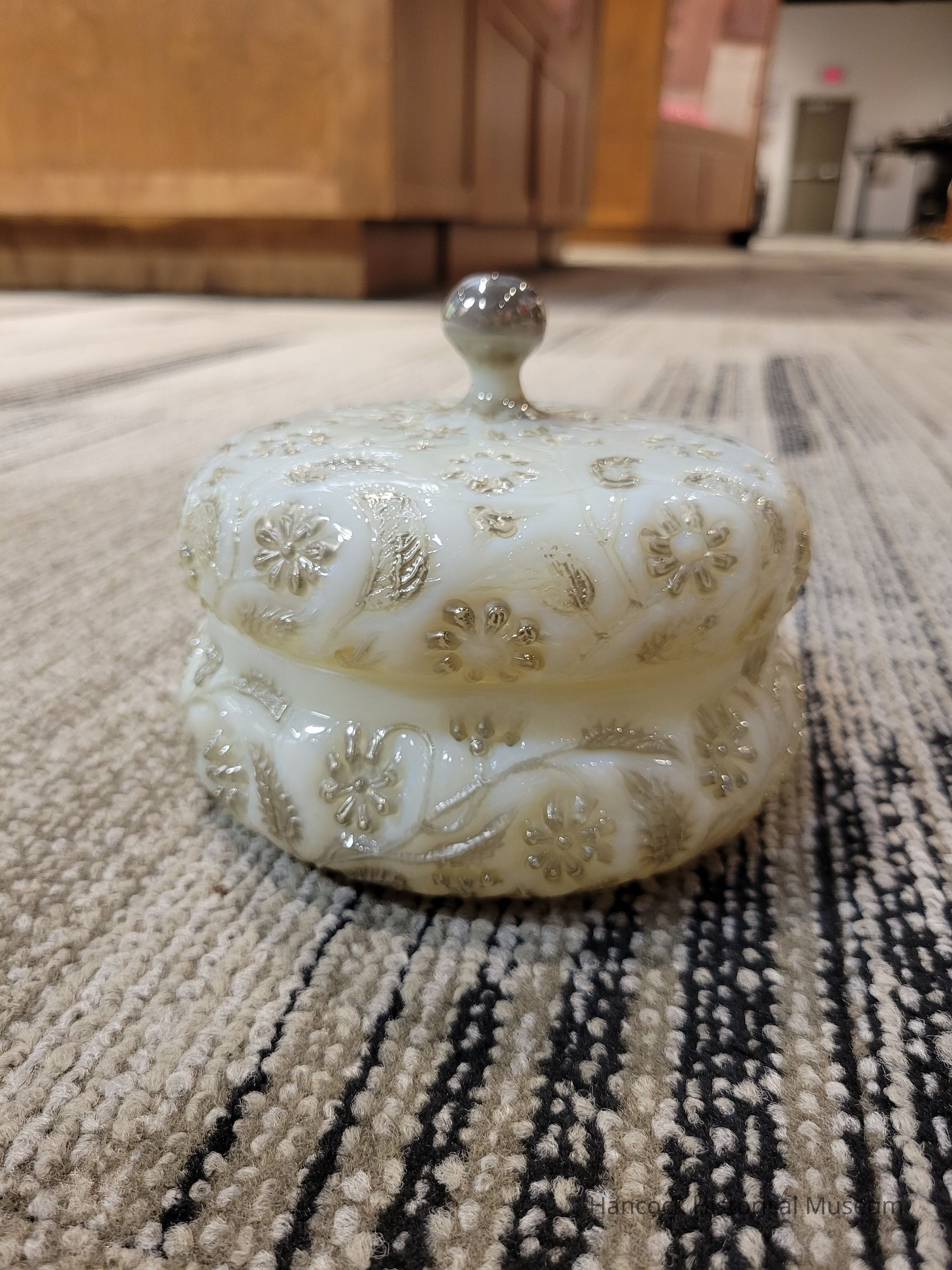 4 x 6" silver onyx glass candy dish w/lid from Dalzell Gilmore & Leighton Glass Co, Findlay, Oh.