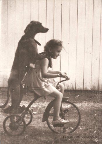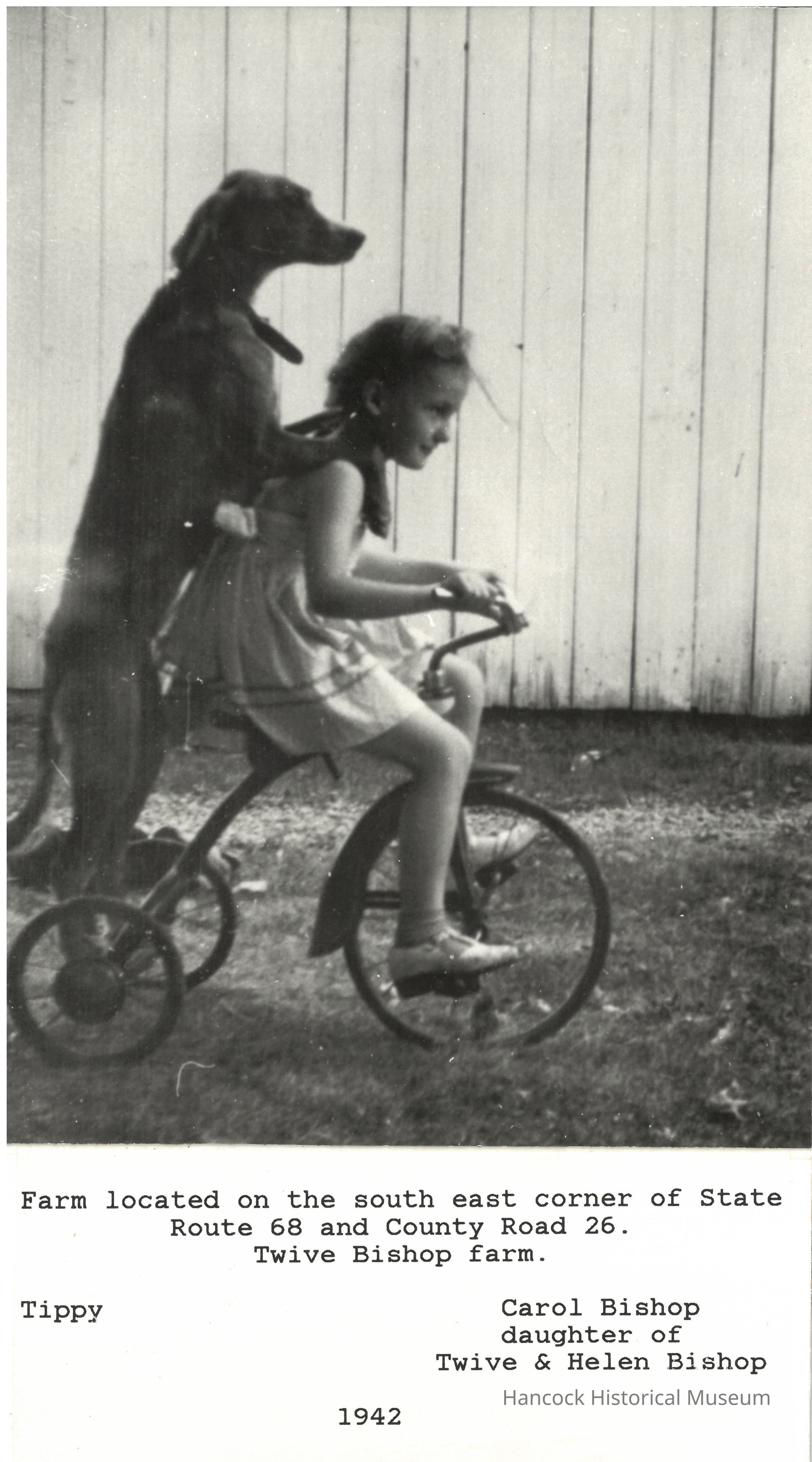 5 cx 7 b/w 1942 photo of Carol Bishop daughter of Twive & Helen Bishop riding a tricycle on the Twive Bishop farm with their dog Tippy riding behind her. the farm is on SE Corner of SR68 & CR26 in Hancock County, Ohio. Photo reproduced by David G Bishop Jan 1996.Photograph Details