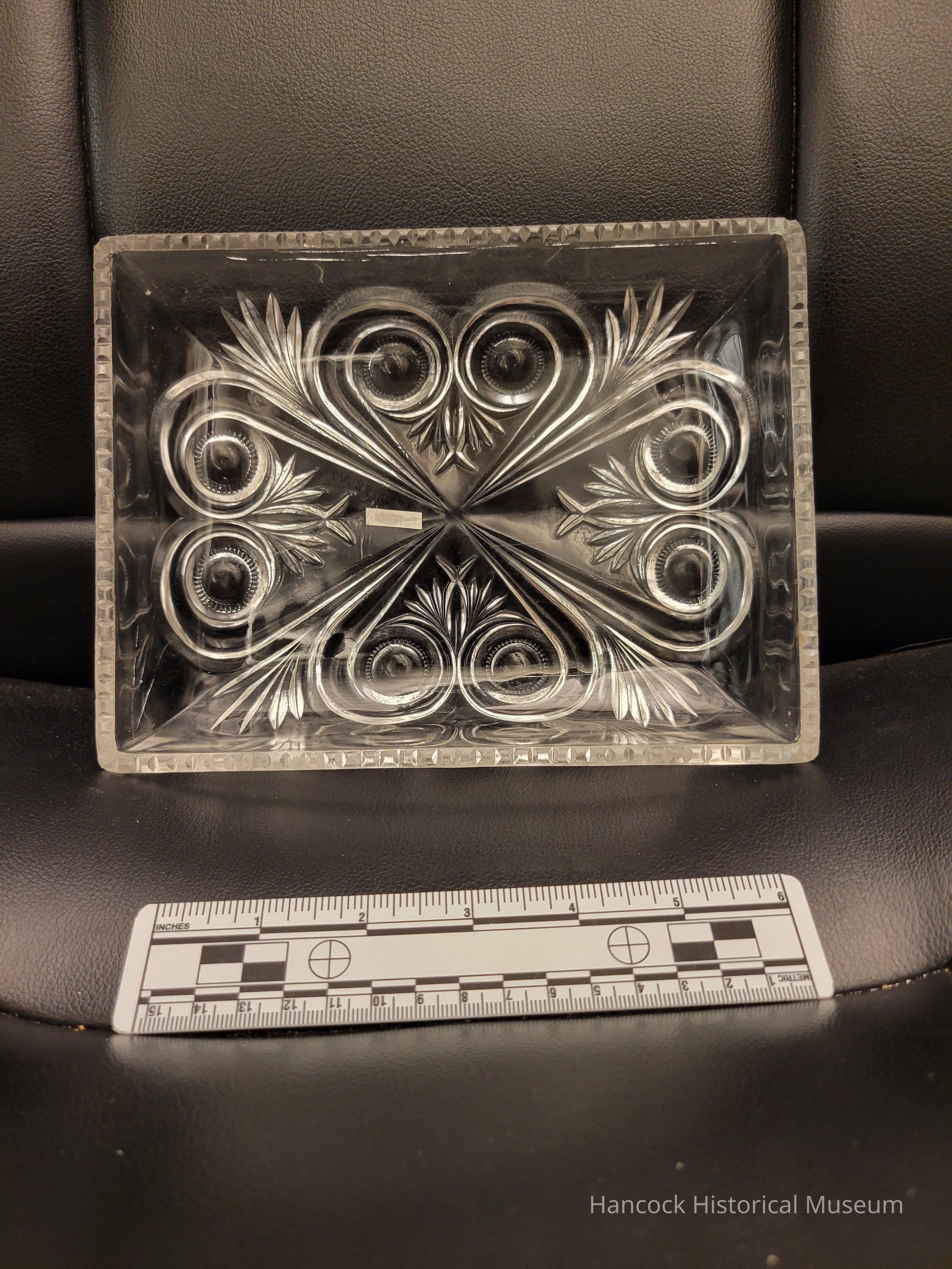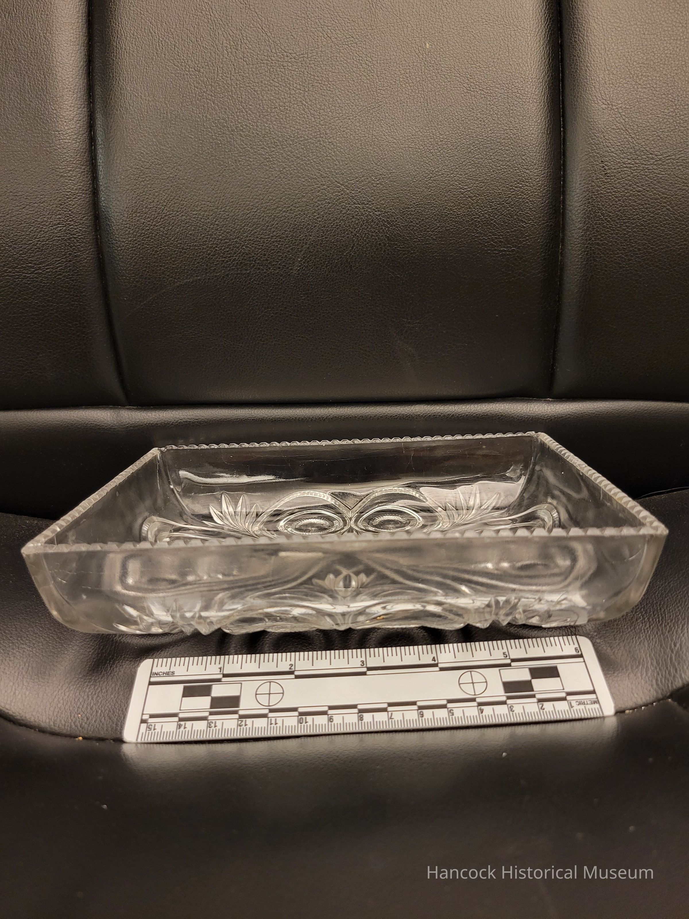 4 x 8" clear glass shallow dish Retort / Owl Face Pattern from Dalzell Gilmore & Leighton Glass Co, Findlay, Oh.