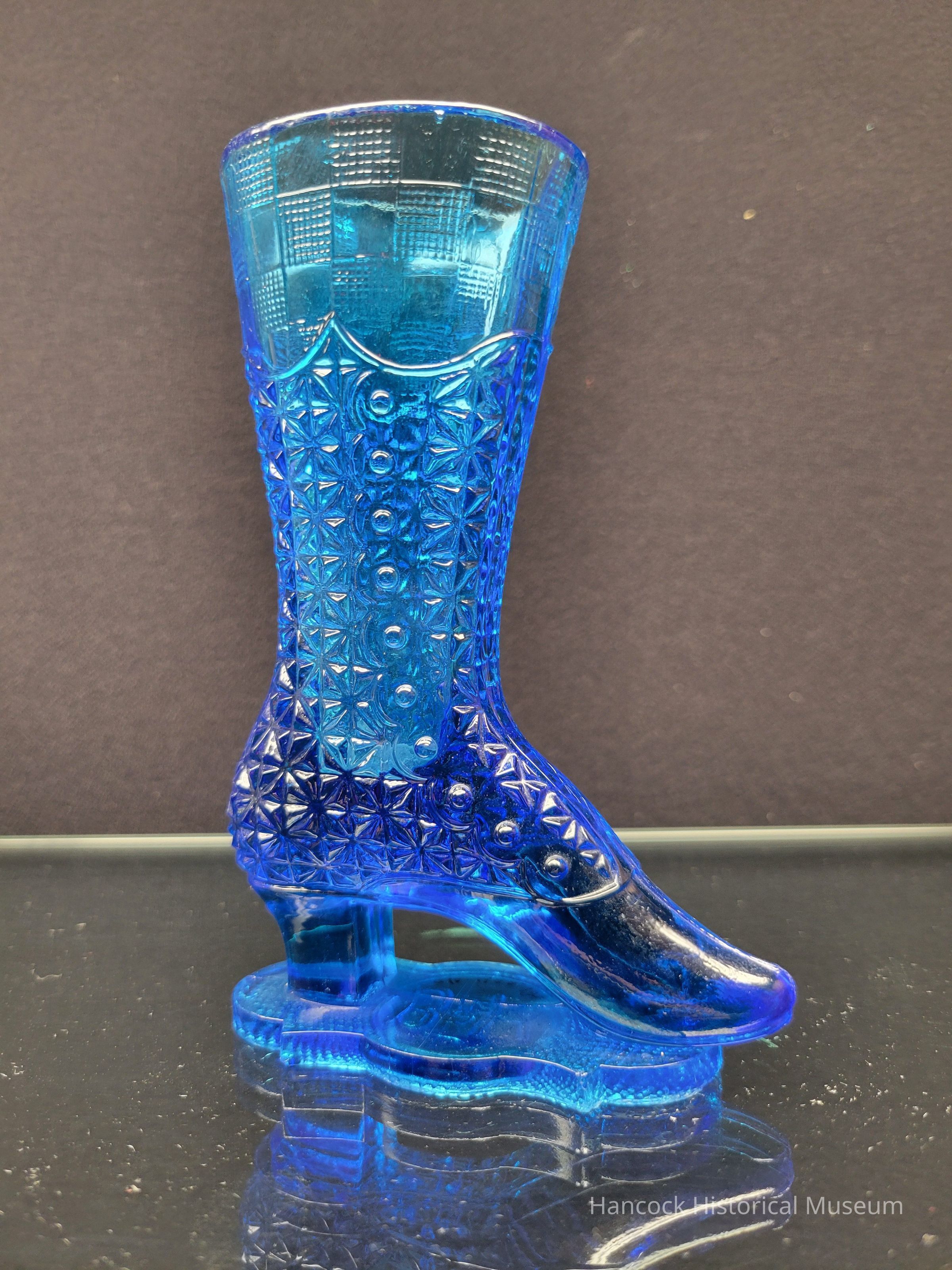 5 1/2" blue glass Fine Cut bouquet Slipper from Bellaire Goblet Co, Findlay ,Oh.Collection