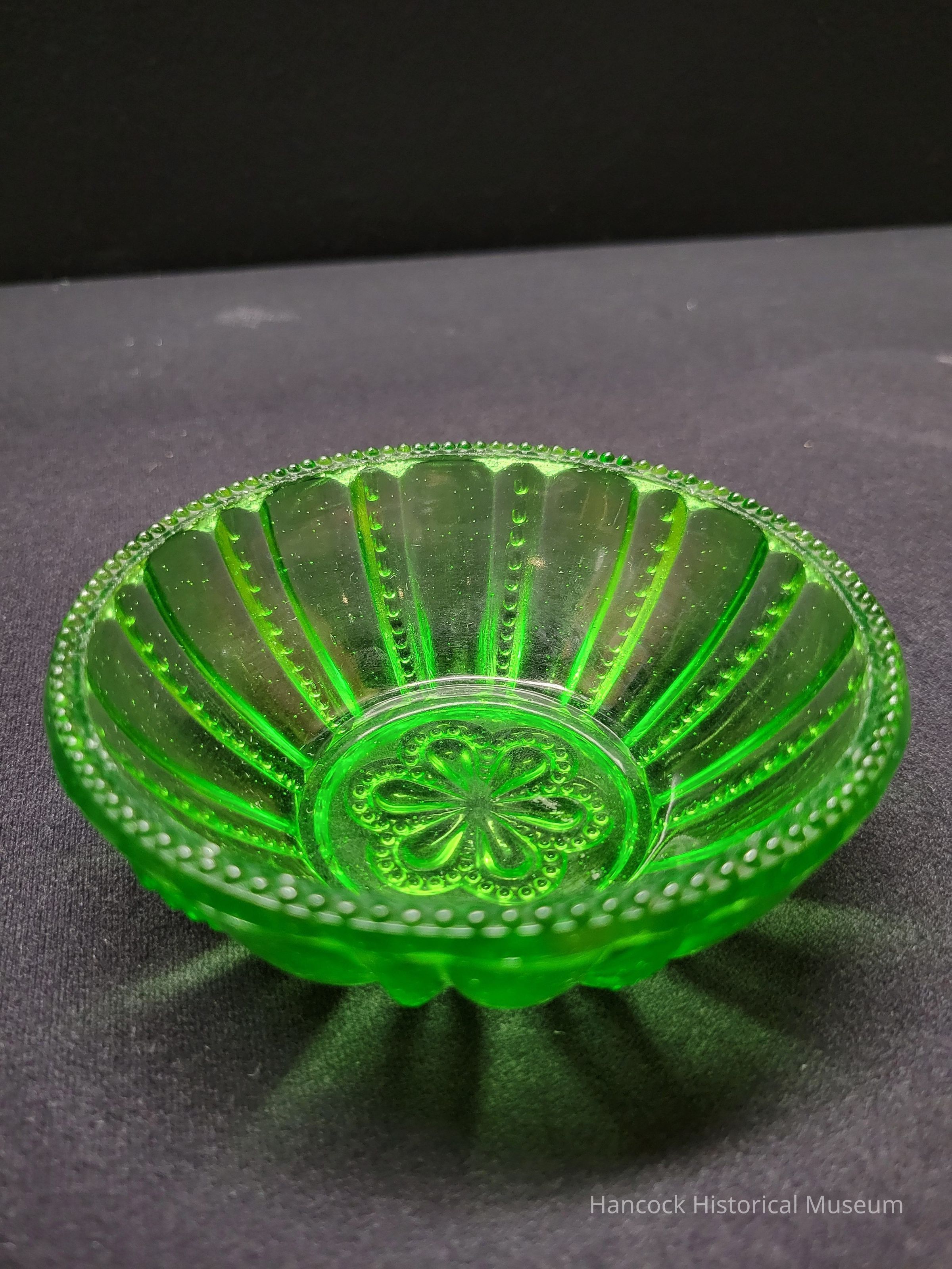 6" green glass dish Beaded Medallion pattern from Dalzell Gilmore & Leighton Glass Co, Findlay, Oh.