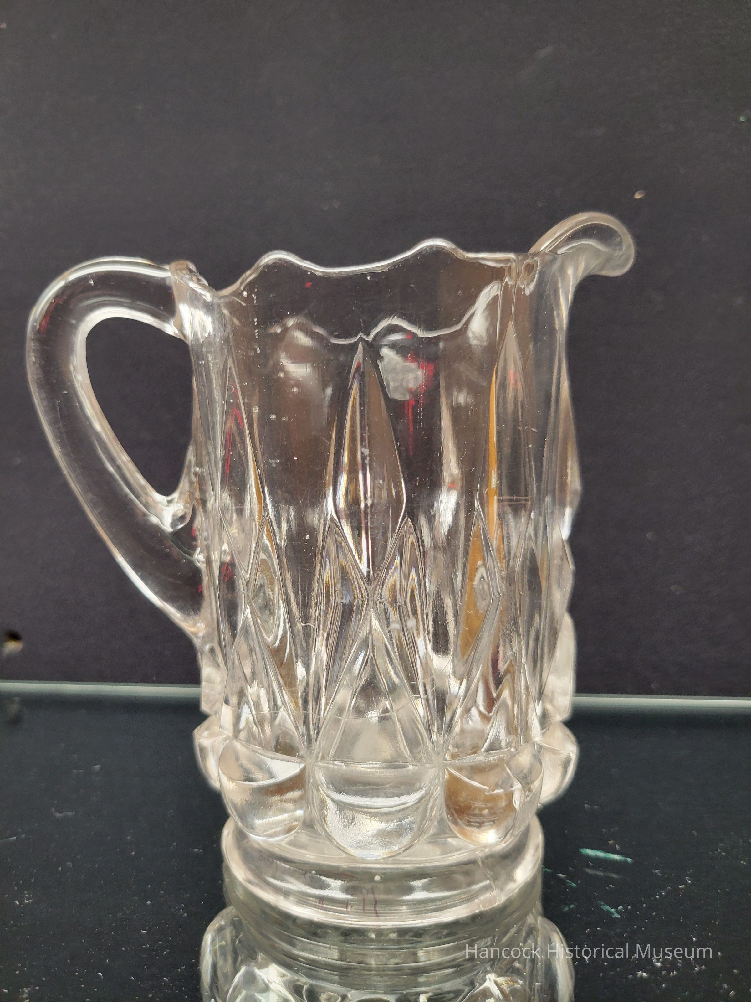 3 1/2 x 6 x 5 clear glass creamer w/handle from Columbia Glass Co, Findlay, Oh Pointed Jewel pattern.