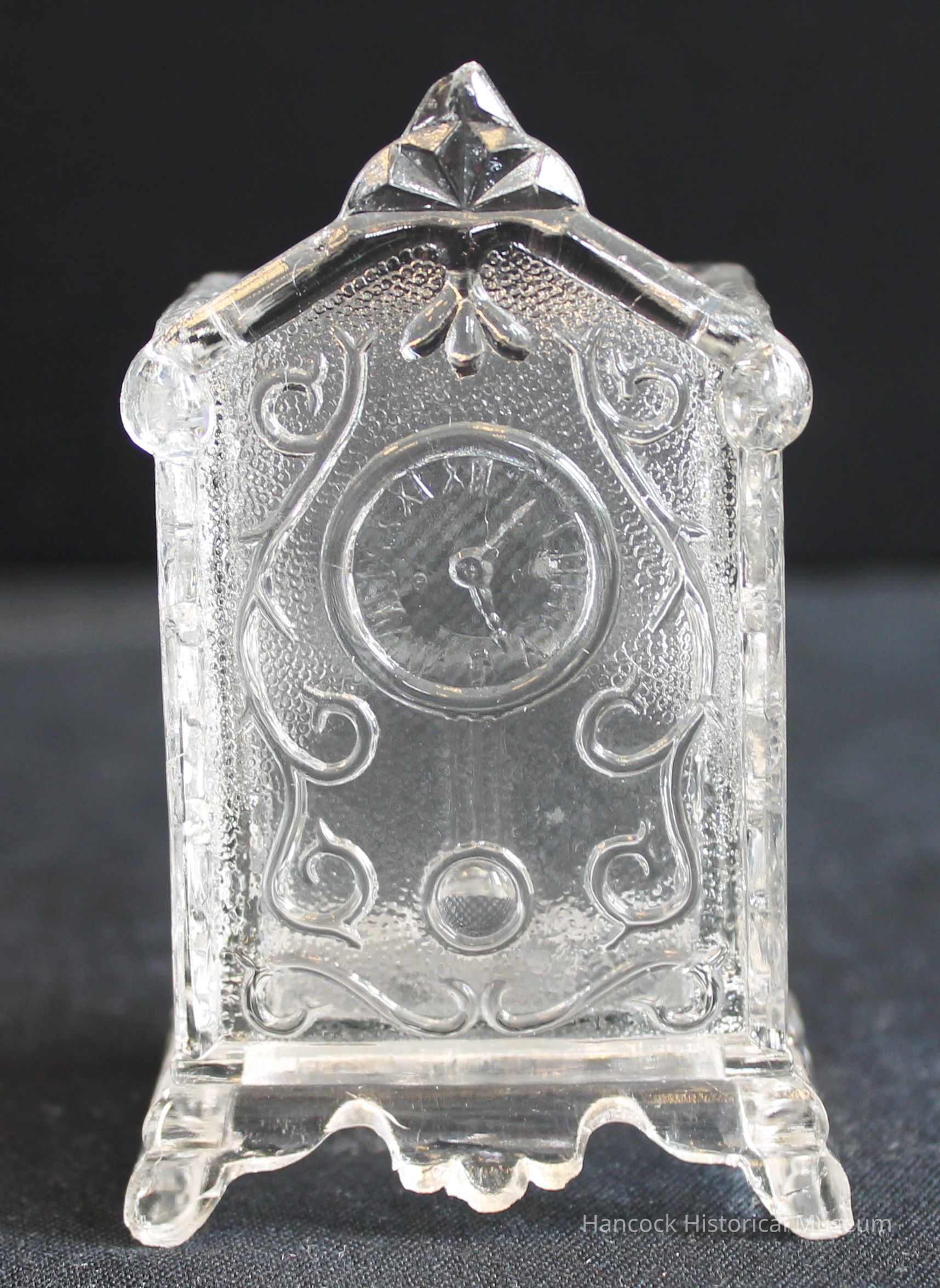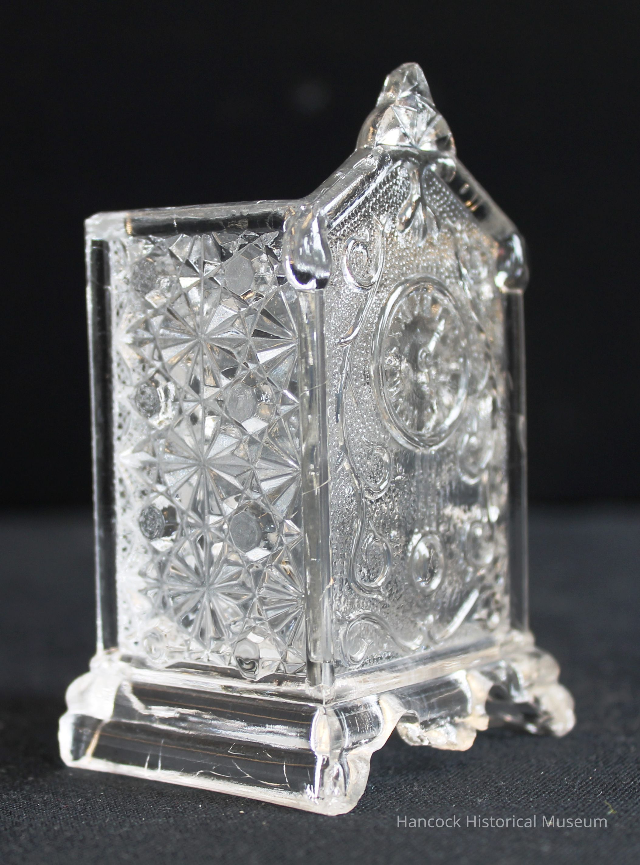 1 1/2 x 2 x 3 clear glass Match Safe made by Bellaire Goblet Co, Findlay, Oh in form of a clock undated.Collection