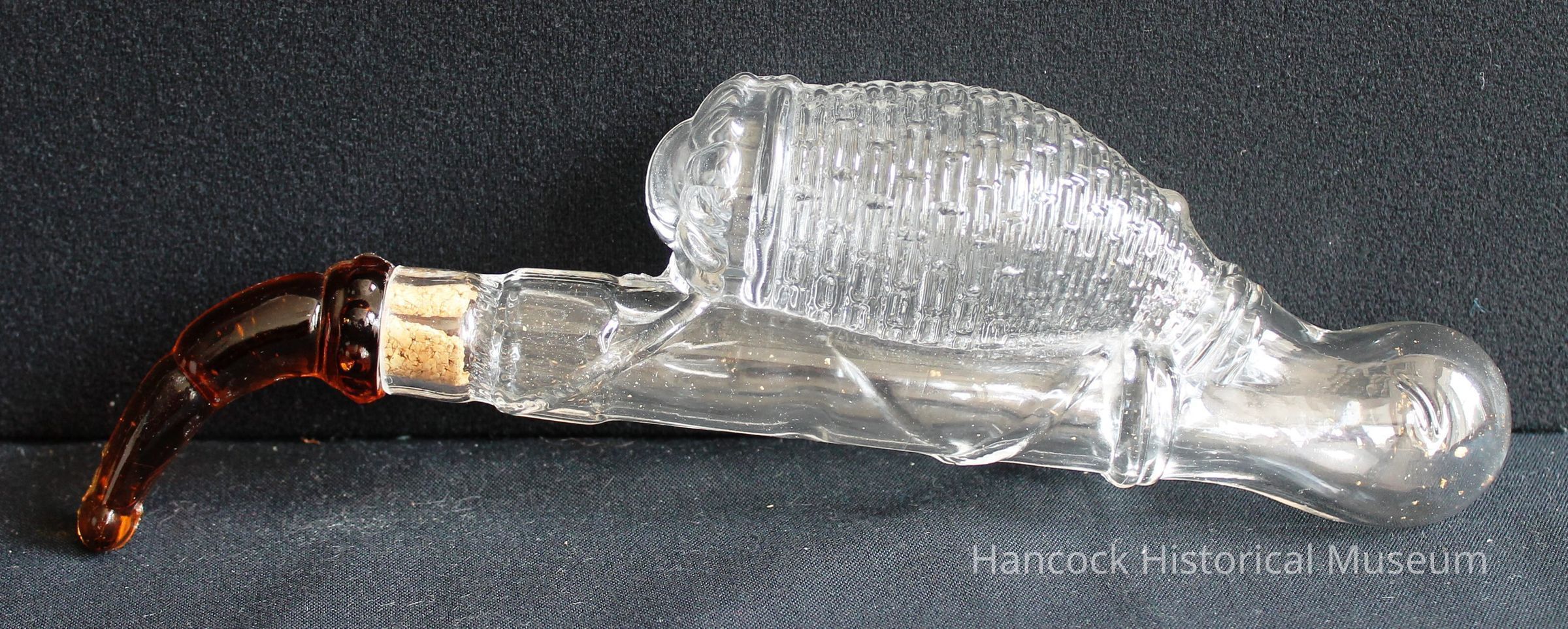 10" tall clear glass pipe bottle from Dalzell Gilmore & Leighton Glass Co, Findlay, Oh with a cork stopper and brown stem.Collection