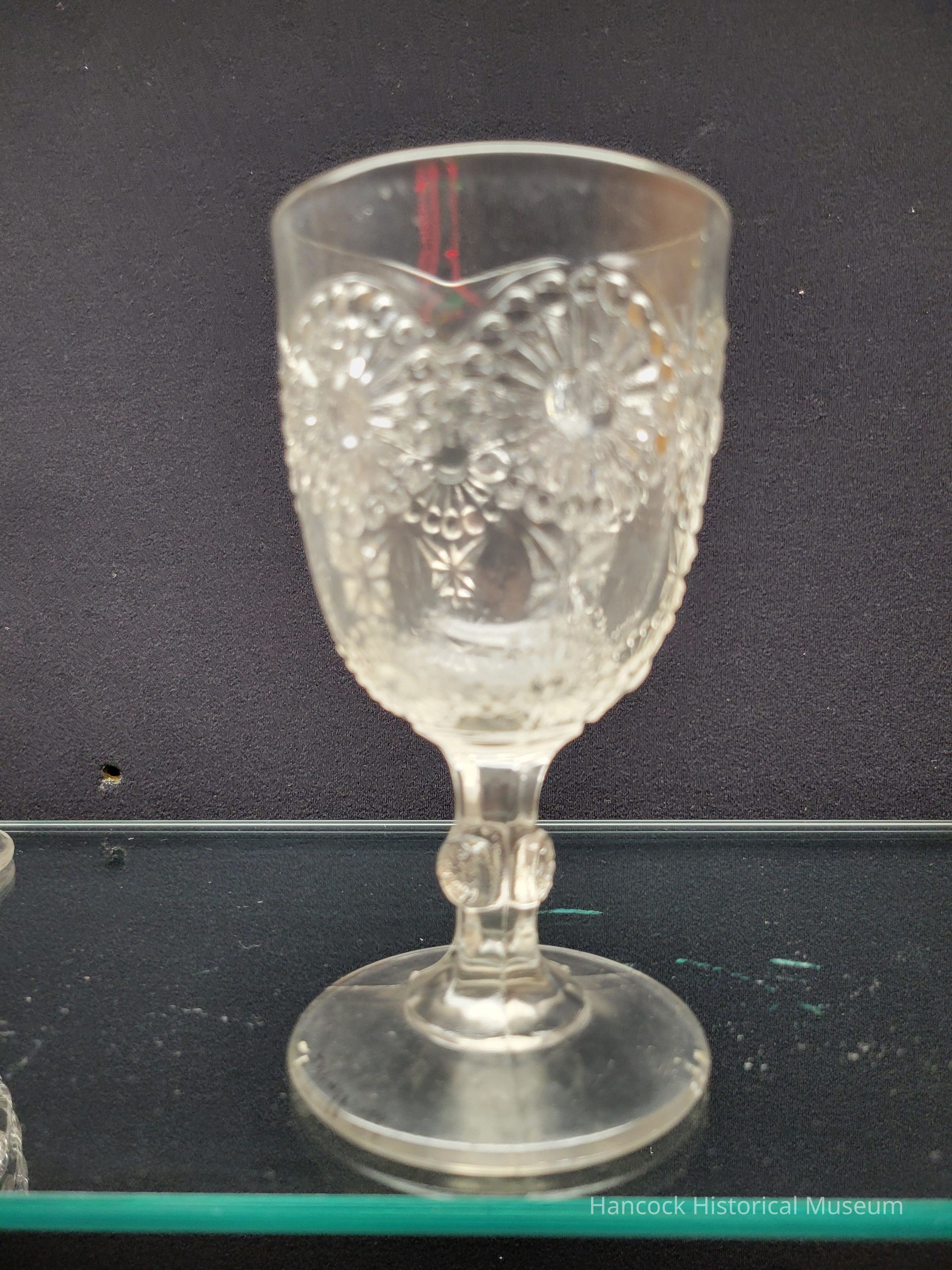 6" tall clear glass Beaded Rosette pattern goblet from Bellaire Goblet Co, Findlay, Oh undated.