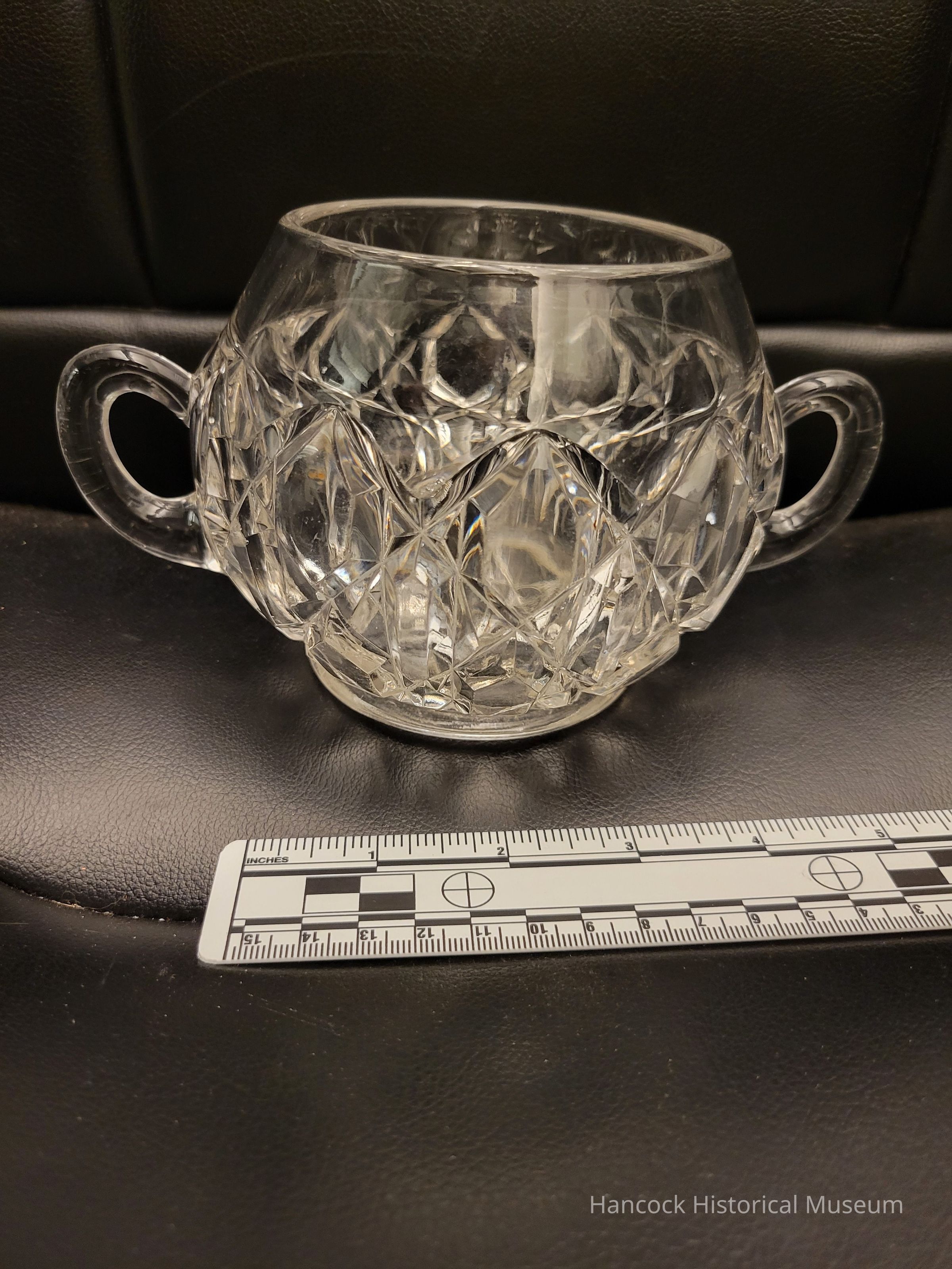 4 1/2: high and 7" wide double handled open sugar bowl in Henrietta pattern from Columbia Glass Co, Findlay, Oh undated.