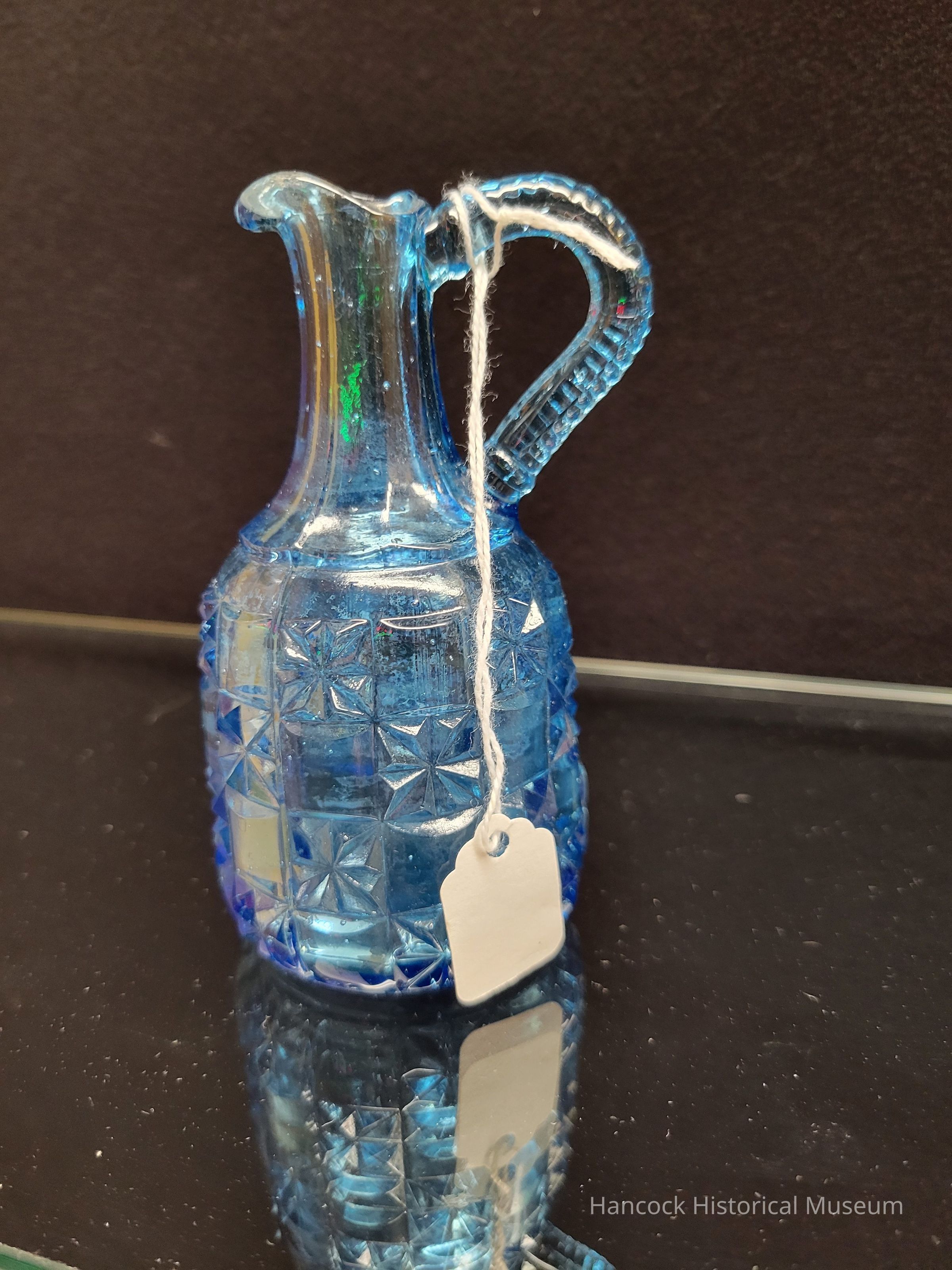 5" tall blue Log & Star pattern cruet without stopped from Bellaire Goblet Co, Findlay, Oh