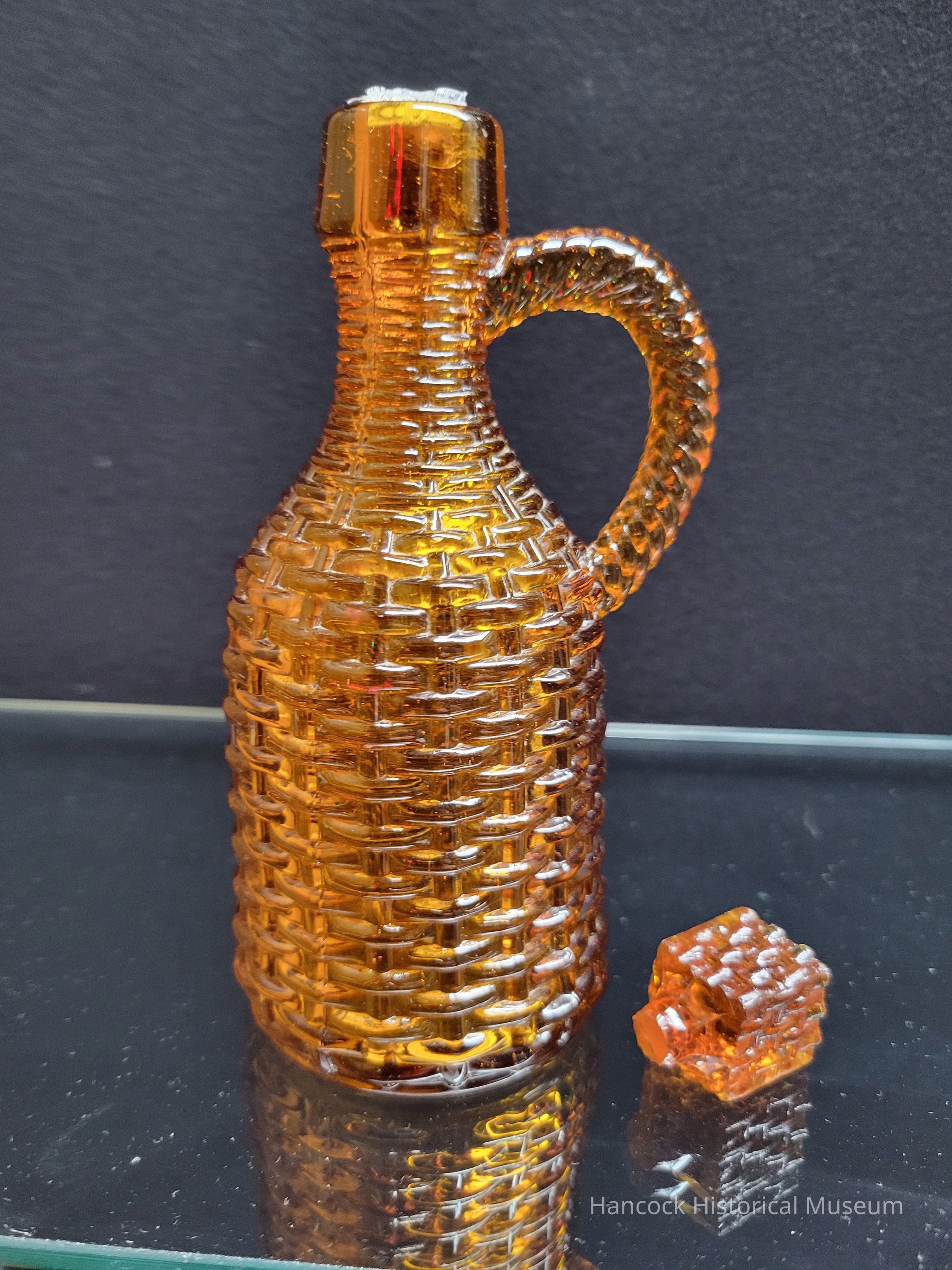 7 1/2" tall amber Basketweave pattern cruet with broken stopper from Bellaire Goblet Co, Findlay, Oh