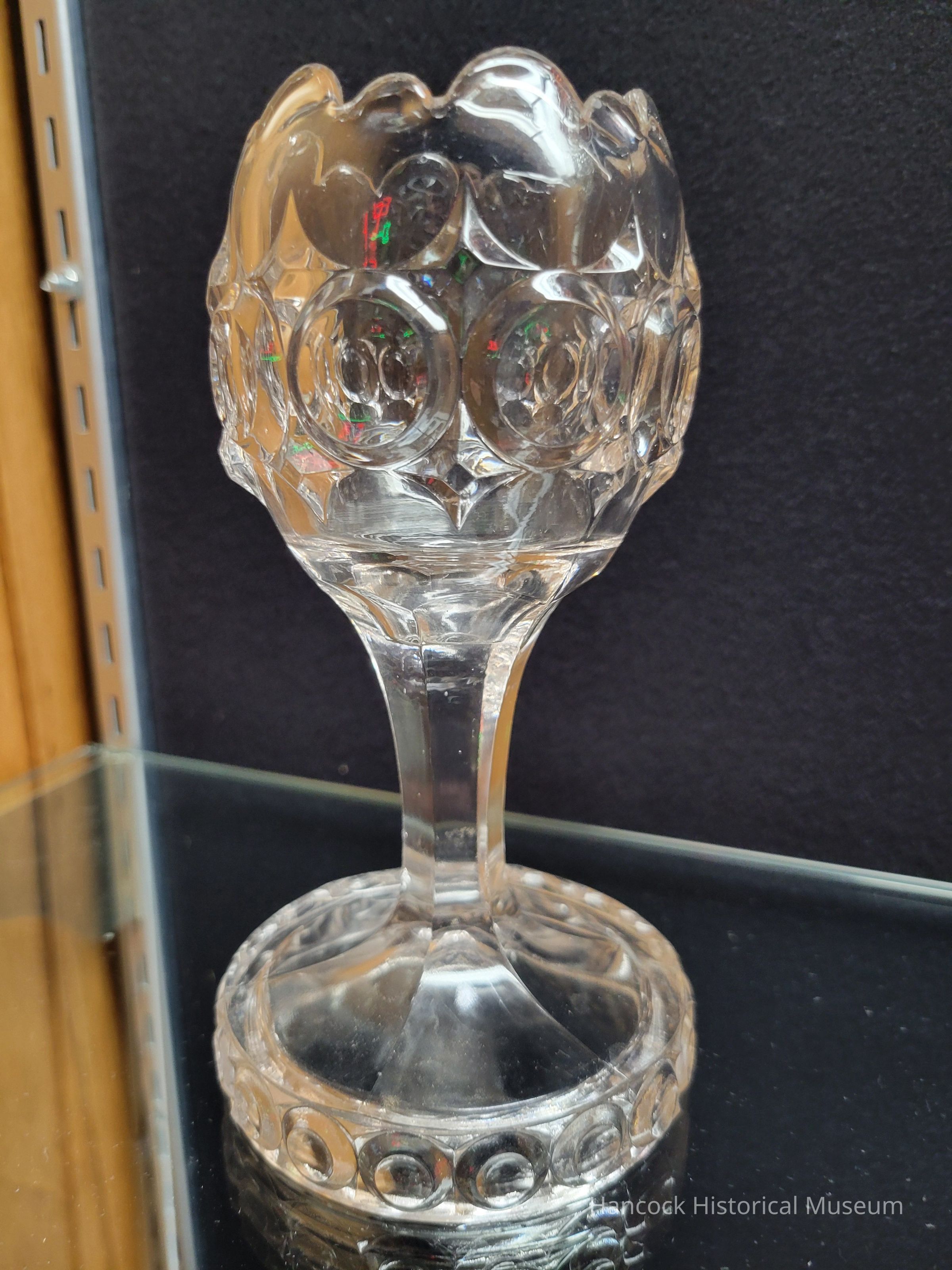 6 1/2" tall with 3" round base and 3" convex bowl with scalloped edges clear glass of Bellaire Pattern from Bellaire Goblet Co, Findlay, Oh.Collection