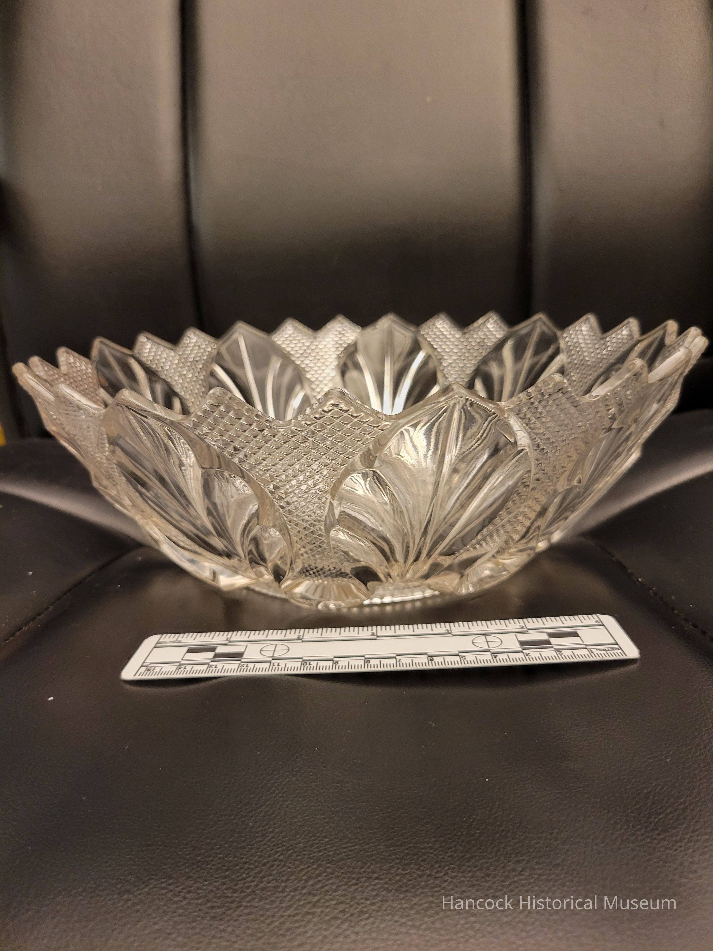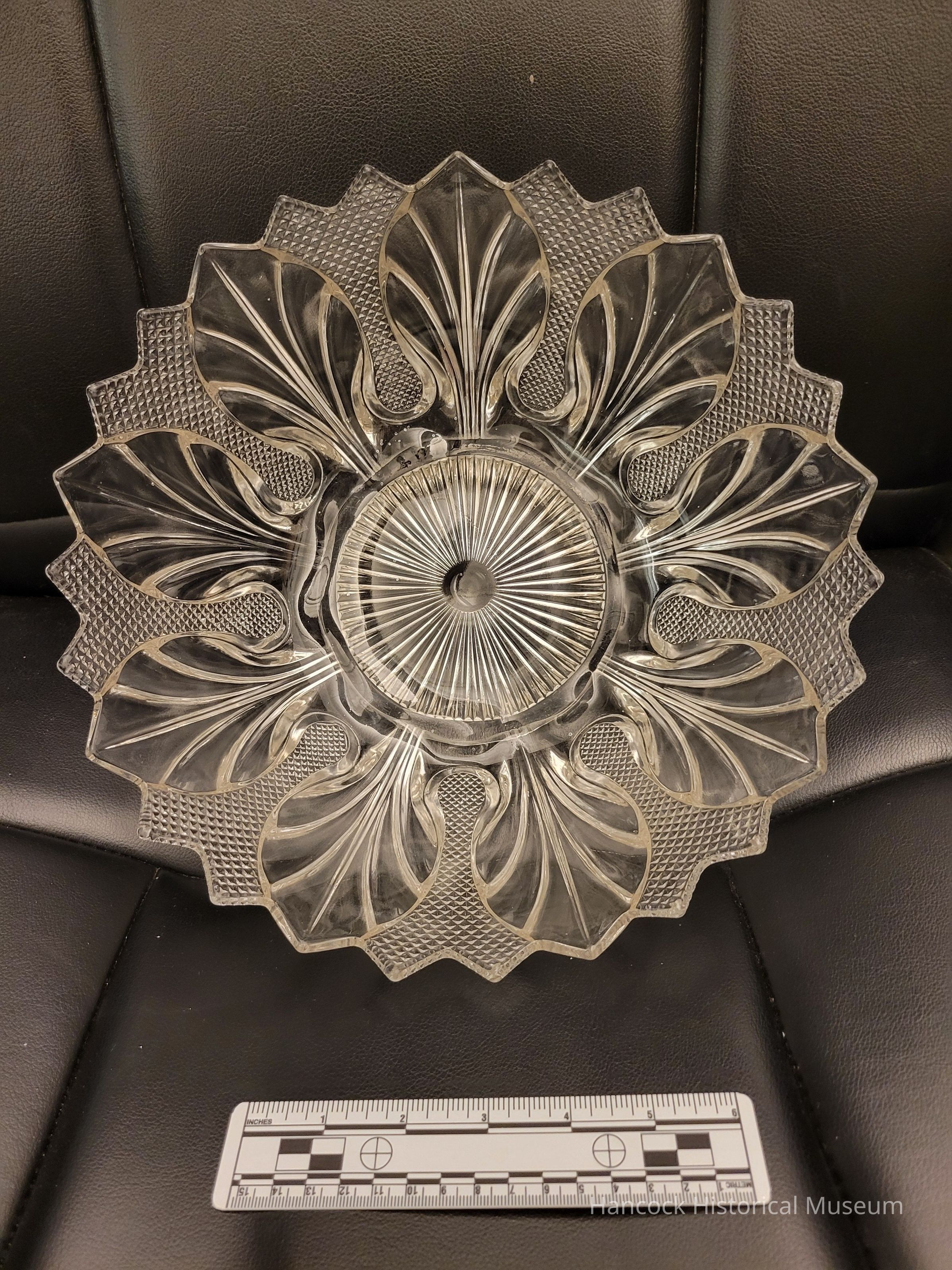 11 1/2" round x 5" round base and 4" tall clear glass salad bowl with pointed edges in Paragon (Kentucky) pattern from Dalzell Gilmore & Leighton Glass Co, Findlay, Oh.